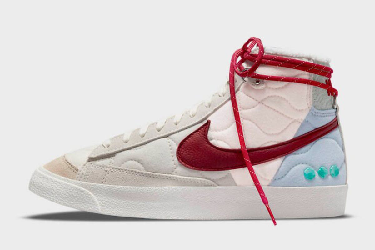 First up is the Blazer Mid, which is arguably the most intricate of the pack, featuring a tri-color quilted upper, jade gems at the heel counter (which appear throughout the collection), and an additional set of red laces that wrap around the ankle via metallic clasps.