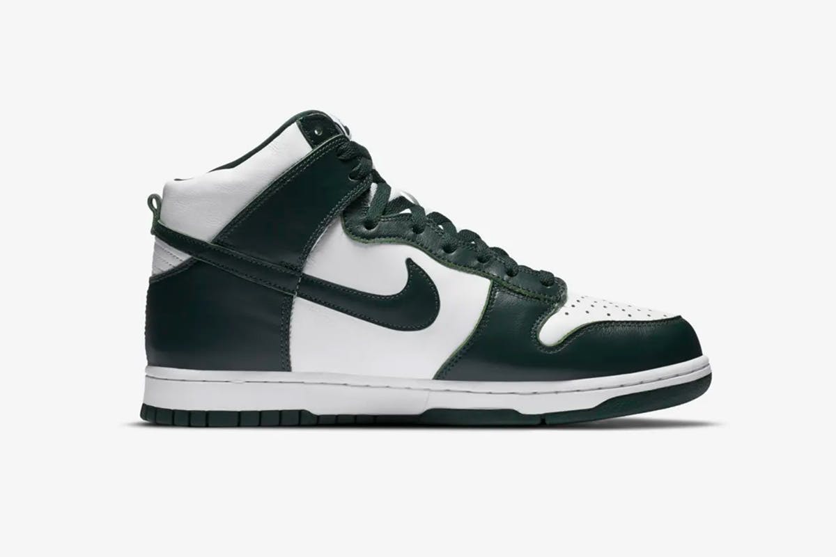 Editor’s Notes: After the Nike Dunk Low has blown up the sneaker game to become the most popular silhouette (again), it looks like Nike is beginning to bring back the Nike Dunk High. This release is inspired by the “Pine Green” Dunk High from 2008 and is an extension of the original Be True To Your School pack, as the “Spartan Green” is a shoutout to Nike-sponsored Michigan State University.