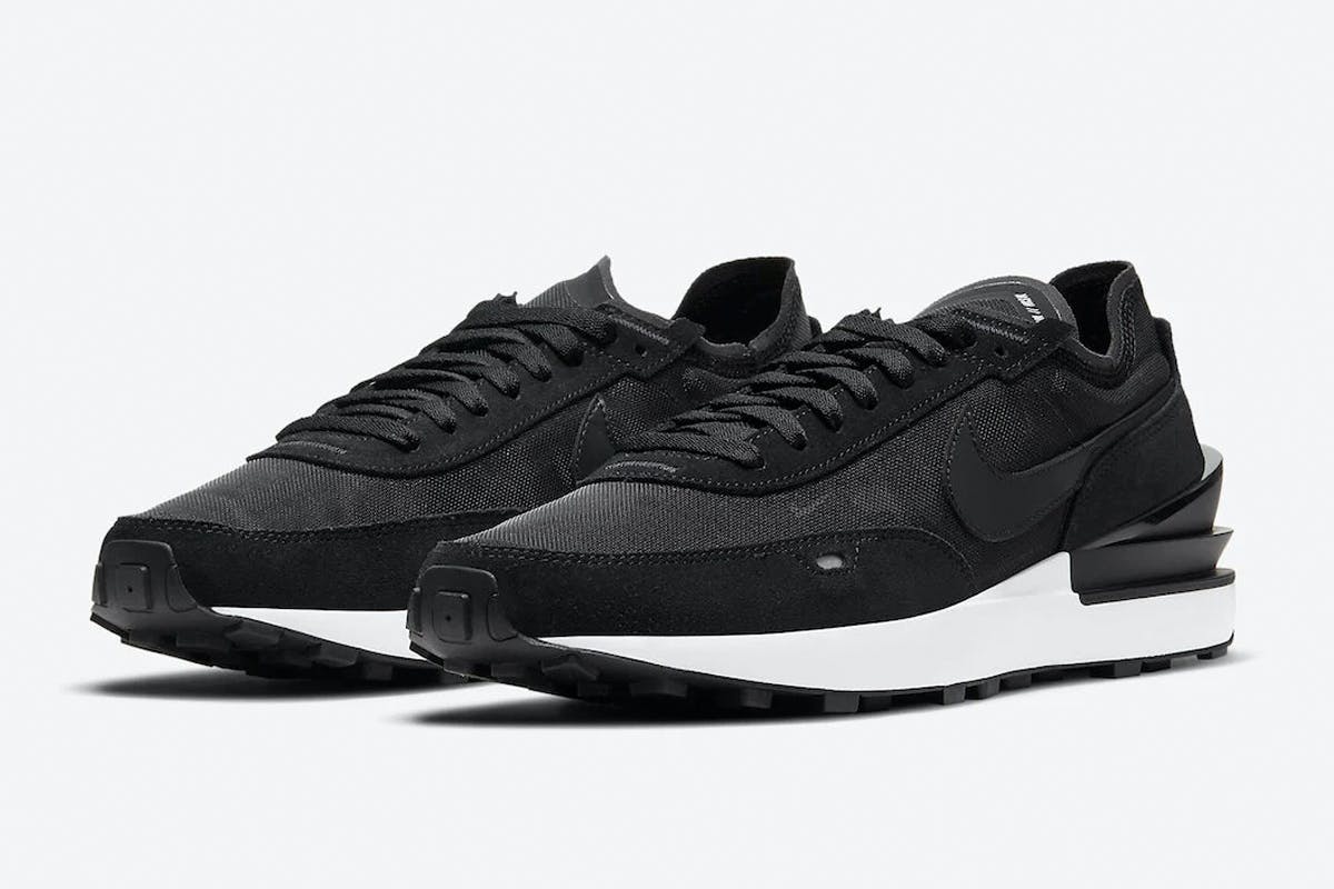 The model looks like a budget version of sacai’s double-everything LDWaffle, dropping in all-white and mostly-black colorways. The Waffle One features a mesh upper with suede overlays and a leather Swoosh on the side. A plastic heel counter protrudes from the heel, similar to the aforementioned sacai x Nike drops. The sneaker's black upper is then contrasted by a white midsole below, while a single pop of color appears in the form of a small red strip on the outsole at the back of the shoe.