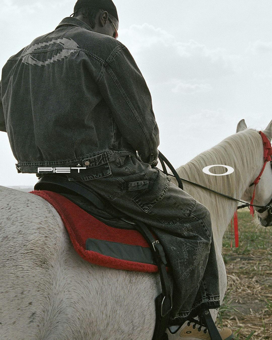 Some western motifs were also present throughout Piet's latest Oakley collaboration, particularly with a deliberately fatigued denim set modeled atop a horse. The yeehaw agenda prevails.
