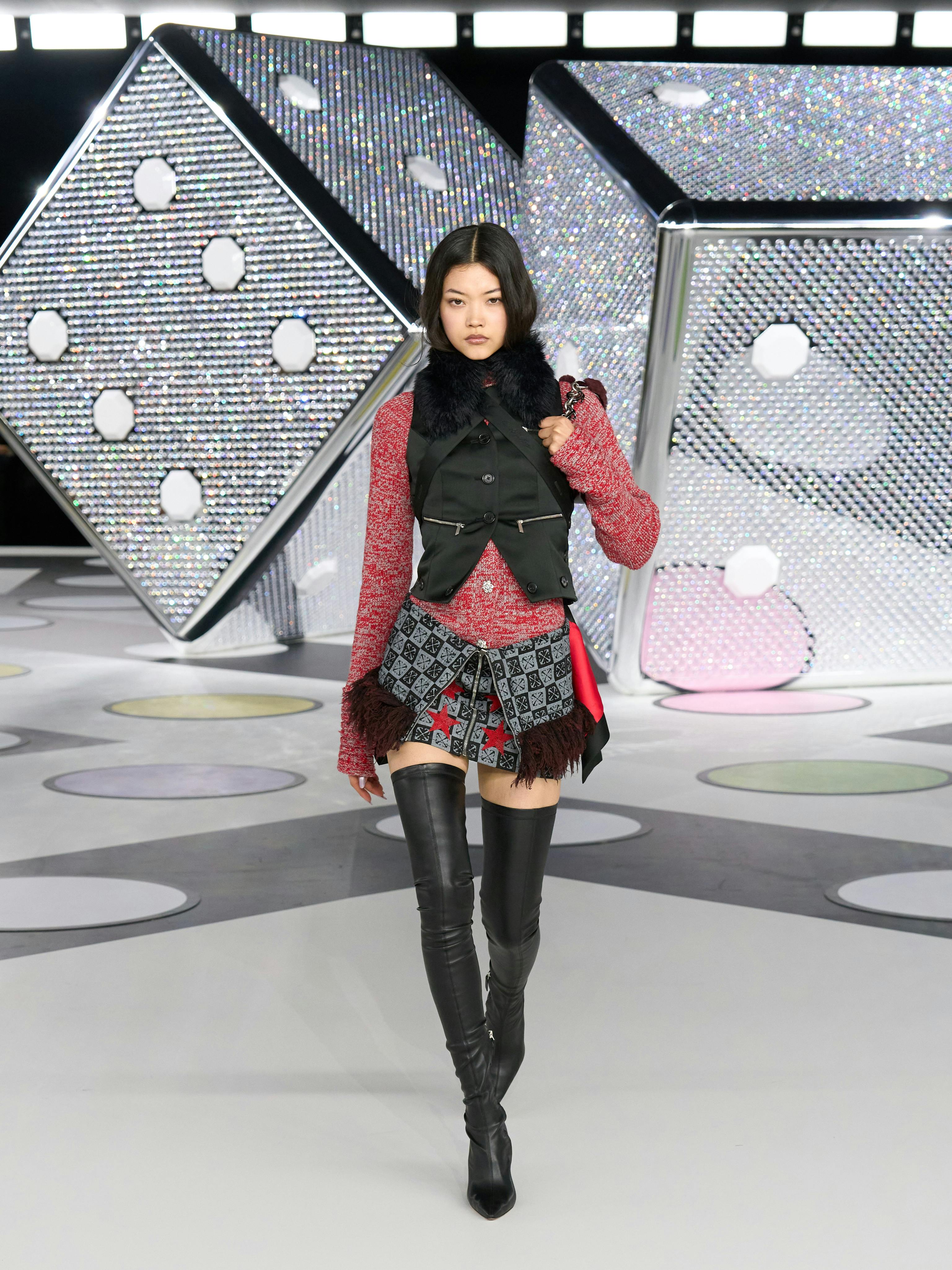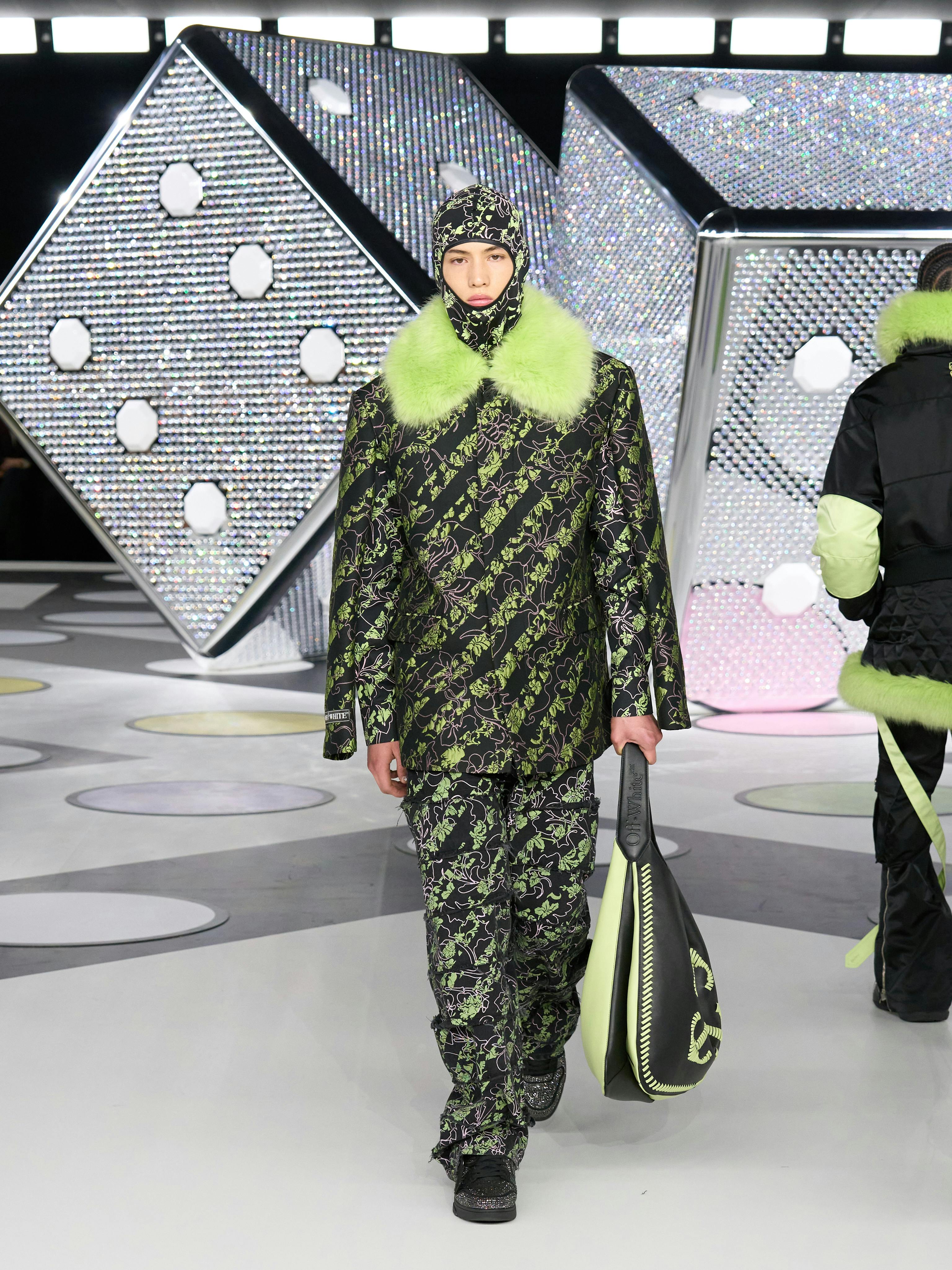 For menswear, silhouettes were widened to embrace languorous shapes, giving a subtle nod to the free-flowing fashions of the ‘90s. Enlivened with Jolly buttons, cardigans brought a touch of prep to the mix, as did rugby polos. Partnering with Wilson, the house hit full-send on rebooting its sportswear DNA with basketball-derivative creations. And while they weren’t bouncing in the literal sense, they did bounce with a certain athletic brio as basketball holders-turned-handbags and deconstructed basketballs-turned-padded sneakers were sent down the runway.