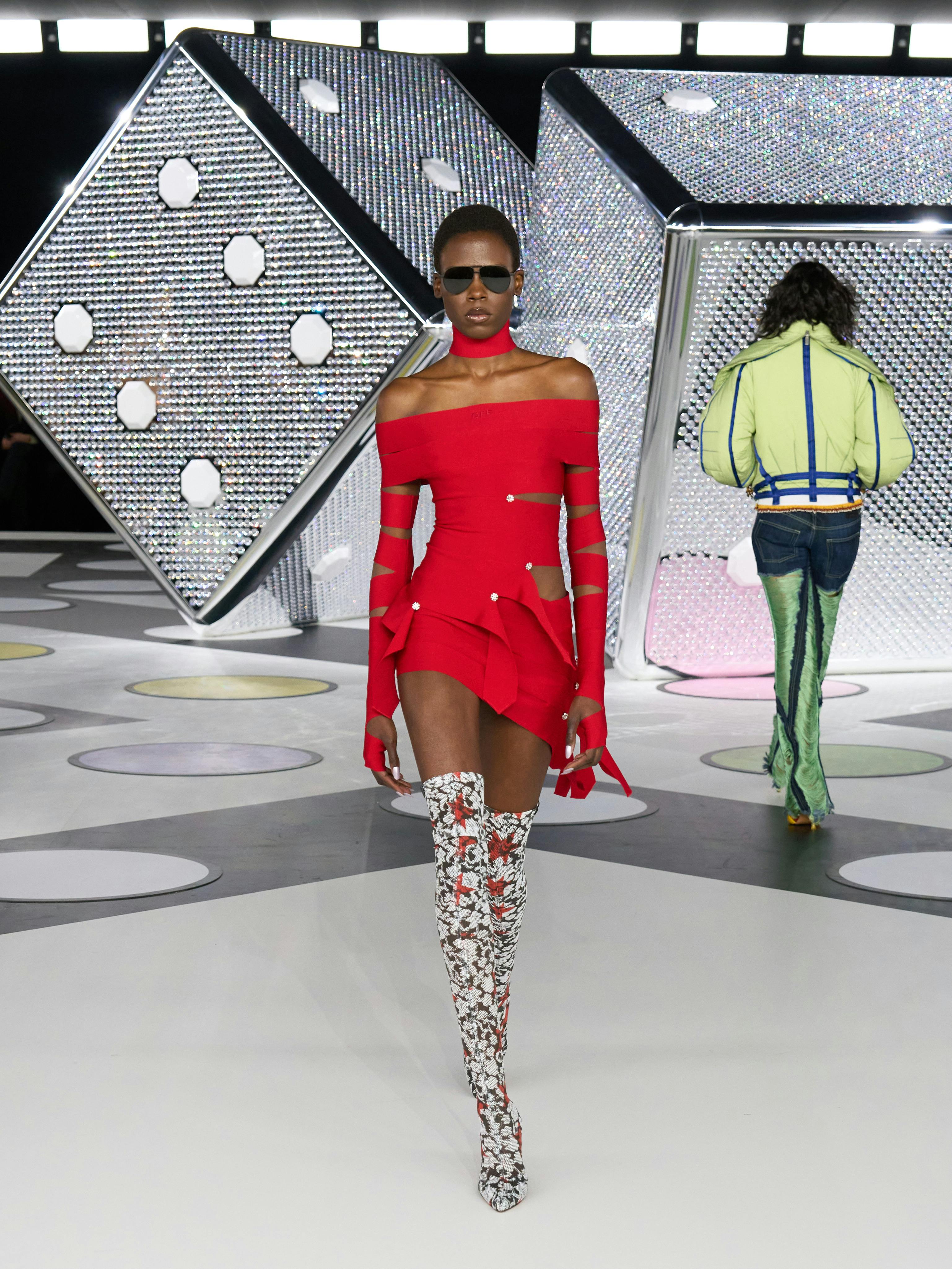 The tilt was indeed joyous. Vivid hues pulsed with energy as strap-heavy ensembles evocative of those donned by cybergoths in heady warehouses were softened with plush furs and shimmering textiles. Spindly cuissardes emerged from beneath bold stripes. It was all very frisky and very fun. Though the clothes were no doubt bestowed with child-like wonder (peep the whimsical hodgepodge of arrows, dice, butterflies, and stars on prints), it wasn’t so much kid-core as the collection waxed post-modern cyber glam, with deconstructed elements harking back to, as Kamara put it, the “urge to wrap fabric around the body.”