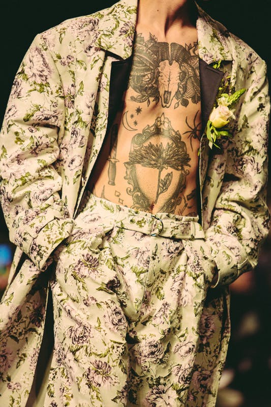 The collection featured oversized blazers, tailored pants with fastenings at the ankle, knitwear, vinyl short-sleeve shirts, sweater vests, floral prints, mismatched shirting, and sporty half-zip tops. Decked out in a playful palette of robust primary colors and muted browns, the collection was styled with unisex shoes and various customised adidas pieces such as jerseys, headbands, and a hybridized denim tracksuit.