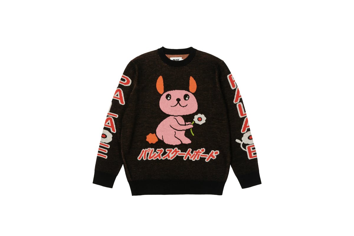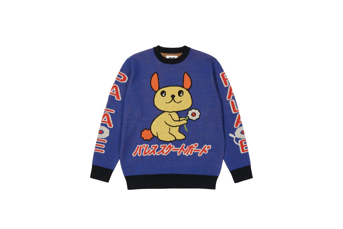 Perhaps the main event is a series of sweaters and hats emblazoned with a little flower-toting critter that's just anime-enough to resemble a bootleg Pokémon, complete with Japanese Katakana to drive home the inspiration. The sweater simply says "Palace Skateboard" [sic] in Katakana, while the accompanying hats shorten it to "スケモン," or "Suke-mon" in the Japanese tradition of creating portmanteau phrases for ease of conversation. It's only the latest in a long line of playful Palace homages.