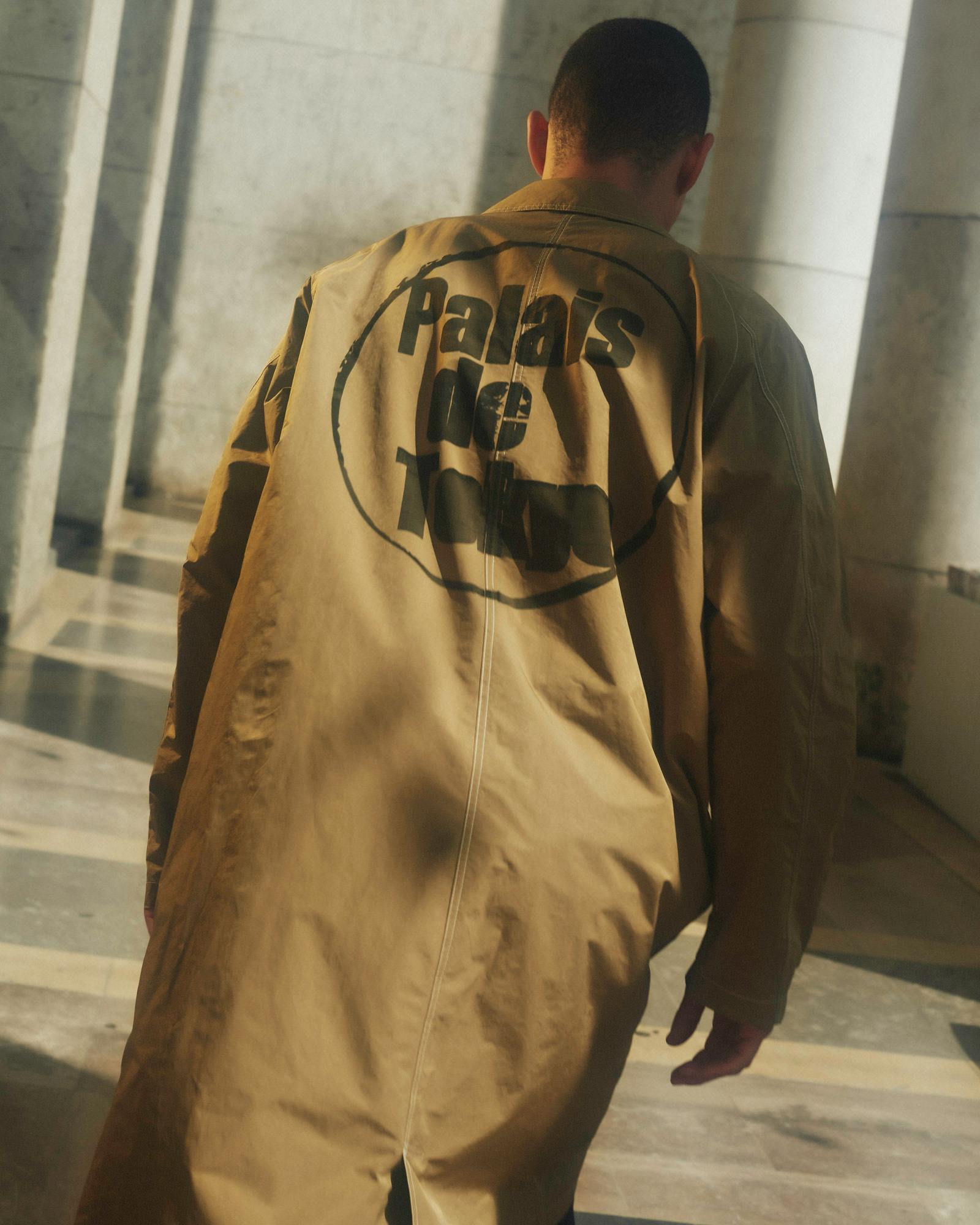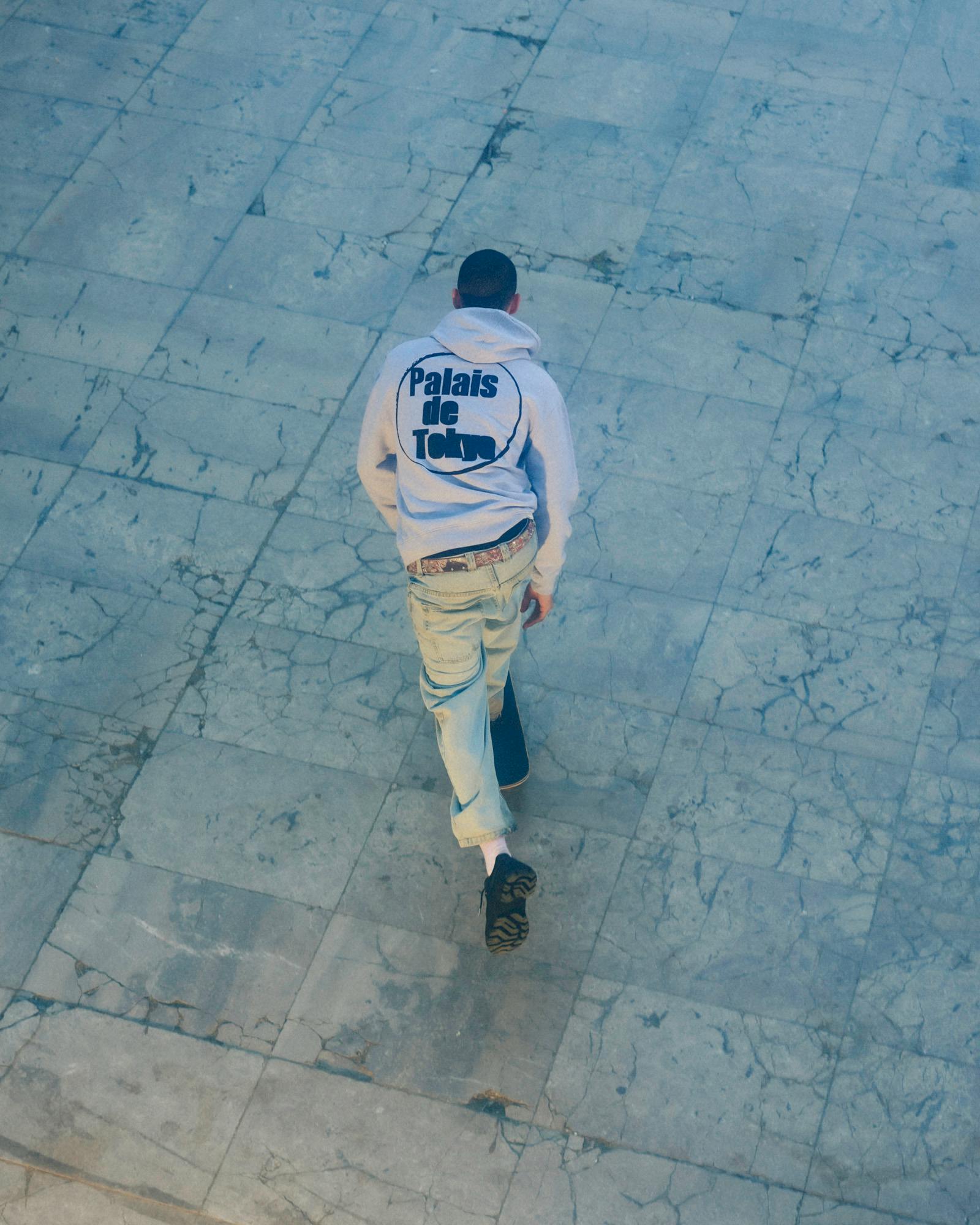 This is channeled throughout our lookbook, where skaters can be seen rolling through Palais de Tokyo in our collaborative long mac coat and grey hoodie.