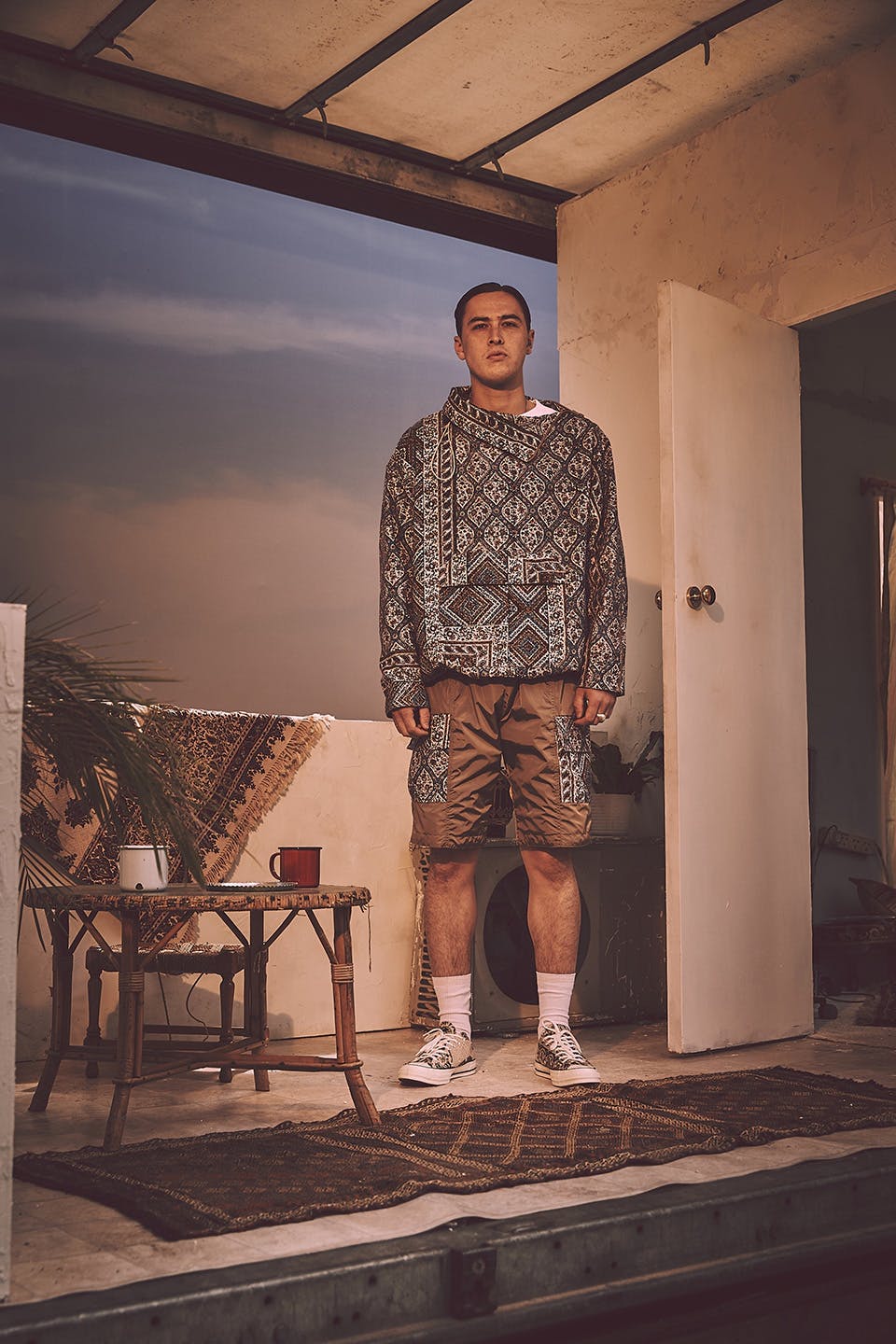 Farzaneh's collection was wearable, clean and highly detailed. A intricate print could be seen recurring throughout the designs, appearing on pants, jackets, short-sleeve shirts, shorts, bags, bucket hats, and Converse sneaker. There was also a selection of clean graphic tees featuring Iranian script and eyeball prints, which broke up the otherwise monochrome-tan collection.