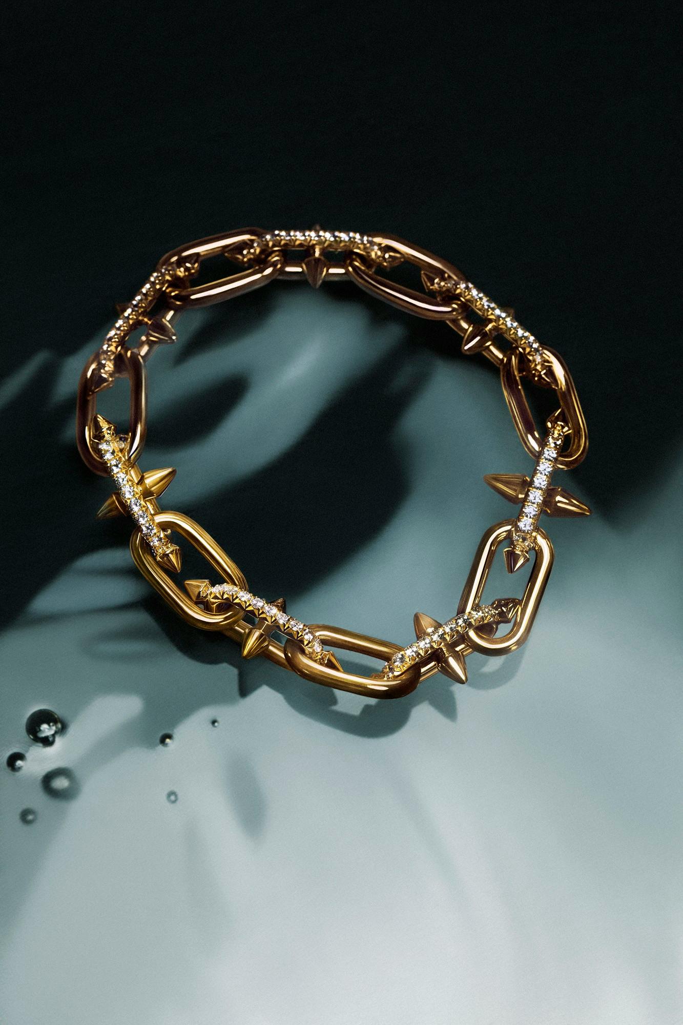 You can see Pharrell's multilayered motifs play out in the jewelry itself. The Tiffany Titan bracelets, earrings, rings, and necklaces are shaped from gold and fitted with diamonds, their rounded silhouettes and sparkling diamonds recalling the ornate curves of the Tiffany Lock.