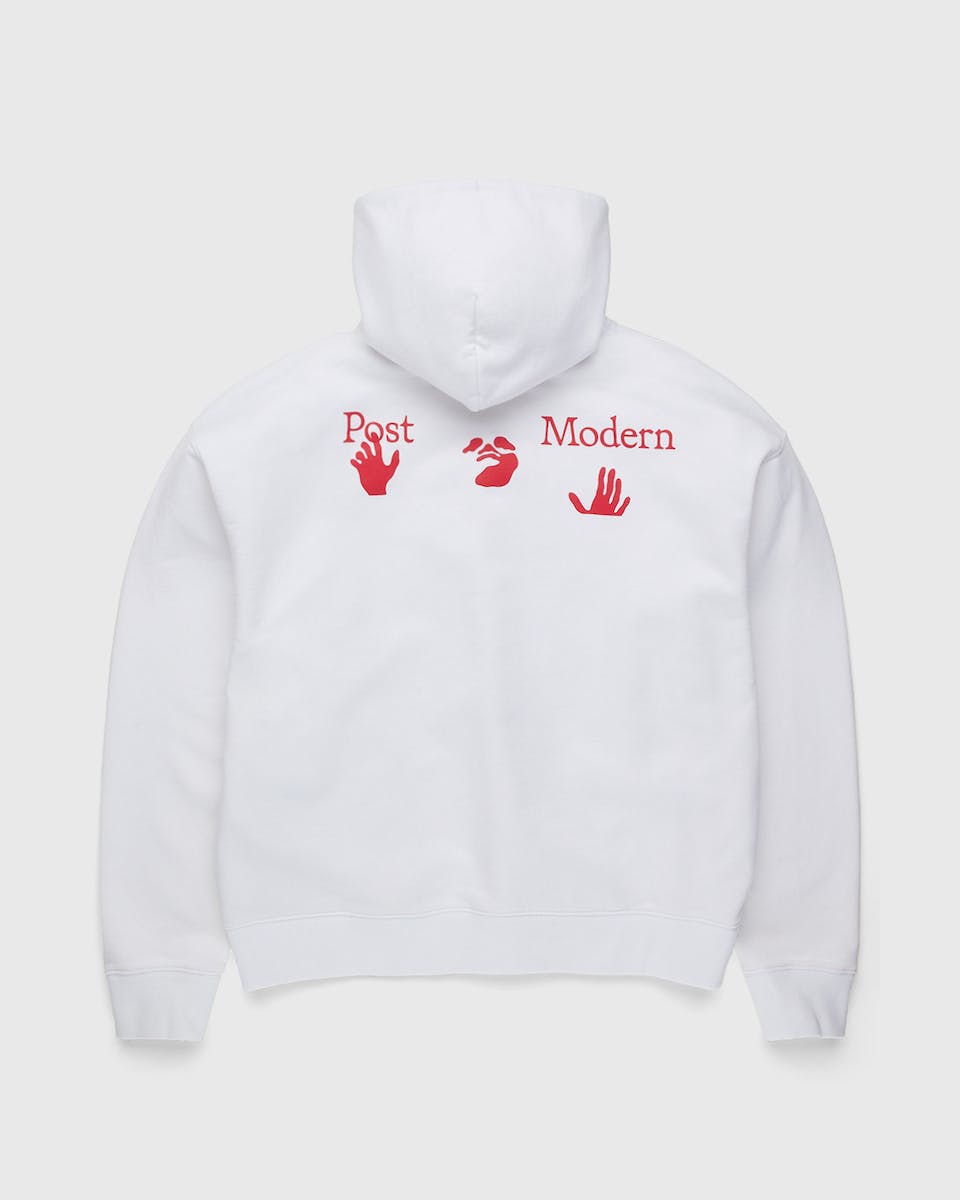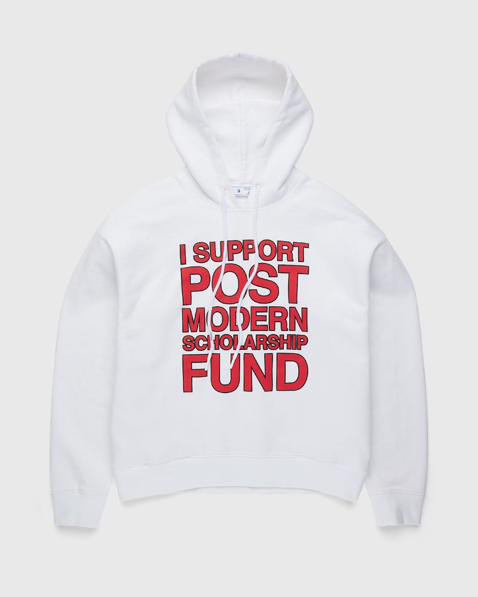 The collection re-uses a format Abloh previously used to show support for young Black businesses, all forms of love, and Black women while endorsing various initiatives. This time around, a bold red font on the front of a white t-shirt and hoodie read, "I Support Post-Modern Scholarship Fund."