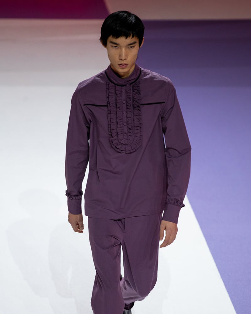 There's been an ongoing conversation among style commentators about whether we're on the cusp of a menswear 2.0 reboot; the grown-up clothing mooted as a panacea to overplayed, maximalist aesthetics. Here, Prada showed us something that was neither ("techno classicism," according to the post-show press-release). This was dapper clothing from the year 2050, like mid-aughts Dior Homme on a heavy dose of mushrooms. It was smart but edgy; loud yet never not refined. Razor-sharp prep crafted by aliens in outer space. Who else would send baroque, ruffled tunics and devilish geometric print trousers down the same runway? While some of us are busy squabbling about what will pop off for menswear in the future, Miuccia is already there, defining it how she sees fit.