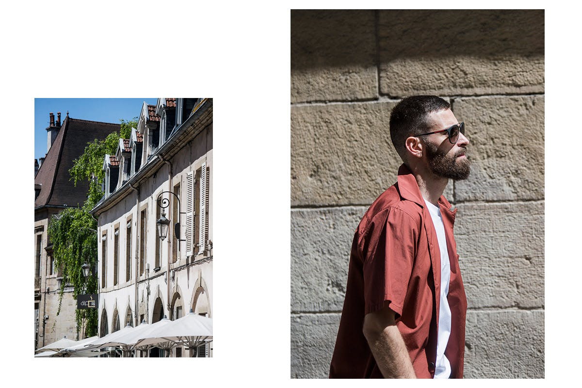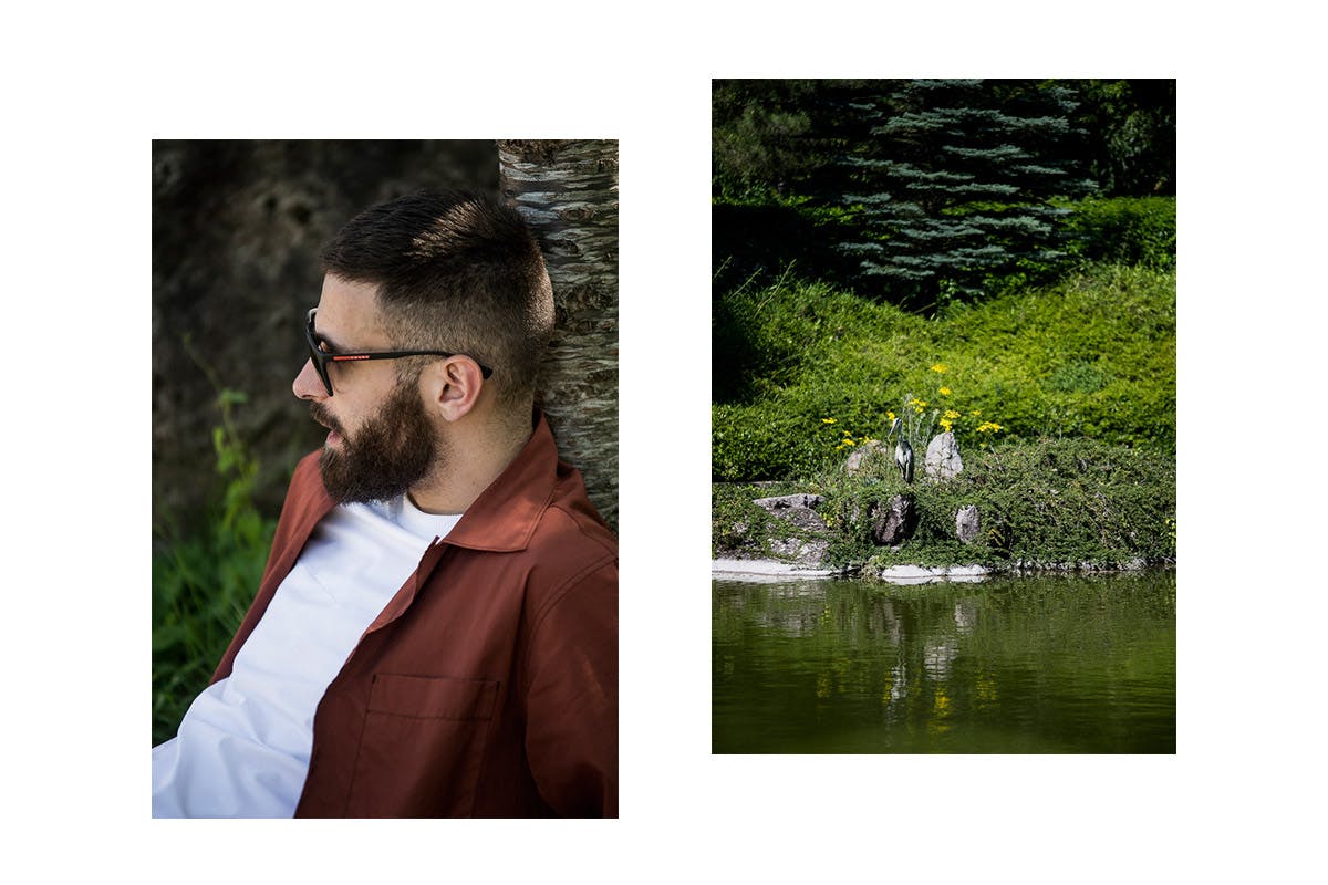 Continuing the video's theme of the importance of relaxation and downtime, the lookbook follows Dos Santos as he walks around his home city of Dijon, from the streets surrounding his office to the city’s Japanese garden—his place of tranquillity.