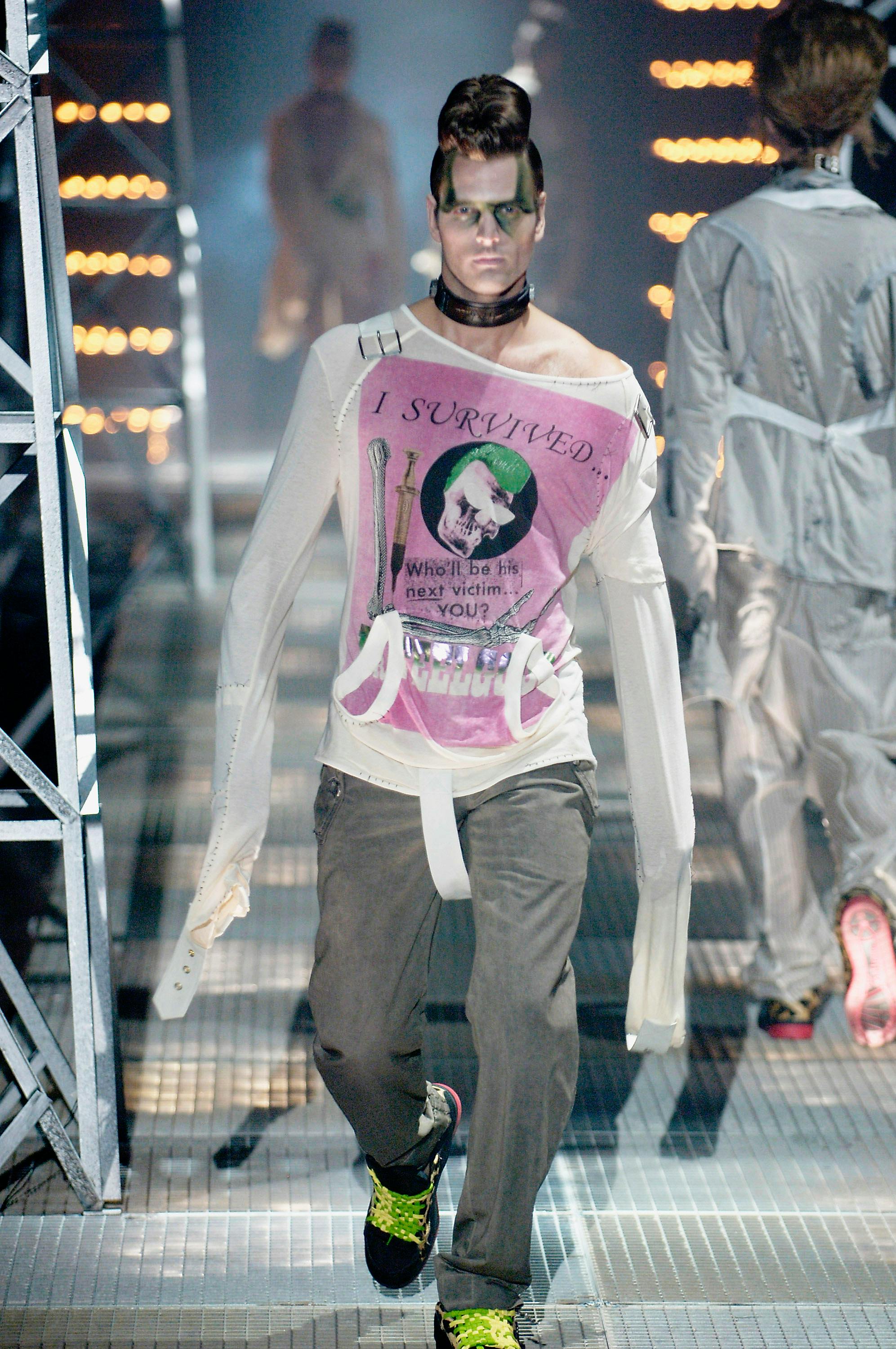 John Galliano made unambiguous punk allusions throughout his time at Dior, constantly reinterpreting and recontextualizing the movement’s unlikely symbols. The Garbage Bag dress worn by Kirsten Dunst and photographed by Annie Leibovitz in Vogue’s 2006 September issue is no exception. A high-fashion take on DIY, it recalls the black bin bags that British punks wore following the social upheaval, riots, and rubbish strikes that characterized the UK’s 1978–’79 “Winter of Discontent.” Punk’s penchant for rubbish bags has since been echoed by more designers, from Gareth Pugh to Moschino and Maison Margiela, and in pop culture, by Zoolander’s bad-guy designer, Mugatu. “Let me show you, Derelicte,” he says. “It is a fashion, a way of life inspired by the very homeless, the vagrants, the crack whores that make this wonderful city so unique.”