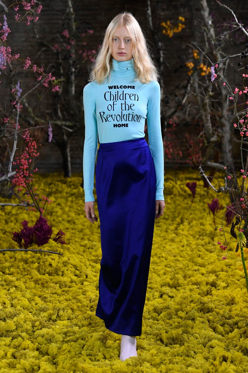 This season's show notes listed the possible inspirations including Alice in Wonderland, seminal ’80s teen movie The Breakfast Club, (as seen by the grungy oversized knits and fanboy badges), and ’70s flick Zabriskie Point, a movie investigating American counter-culture which has since achieved cult status. The collection's milky, opalescent color schemes may have also been inspired by the palette from Annihilation, which was also singled out as a reference.