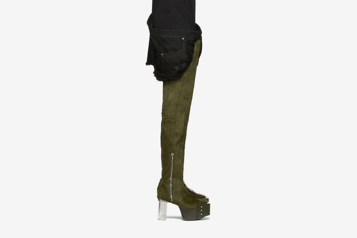 Owens's platform waders are just as conspicuous. With a shaft that climbs nearly all the way up the thigh, they're basically pants. And in fabrications including dark green ponyhair, the boots resemble something like centaur legs.