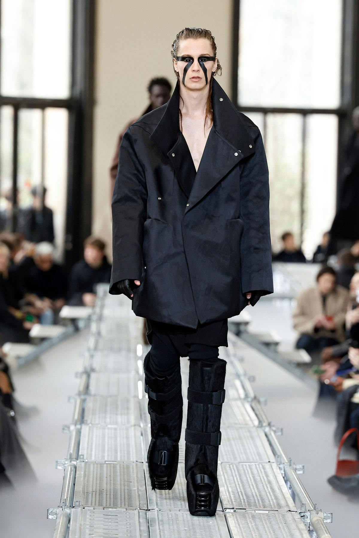 Think Julia Fox's eye makeup, amplified to the nth degree. Models sported thick lines of black that traversed from the inner ear to the inner corner of the eye, down the cheek and to the center of the jaw. Black eye contacts rendered it nearly impossible to tell if the models' eyes were open or closed.