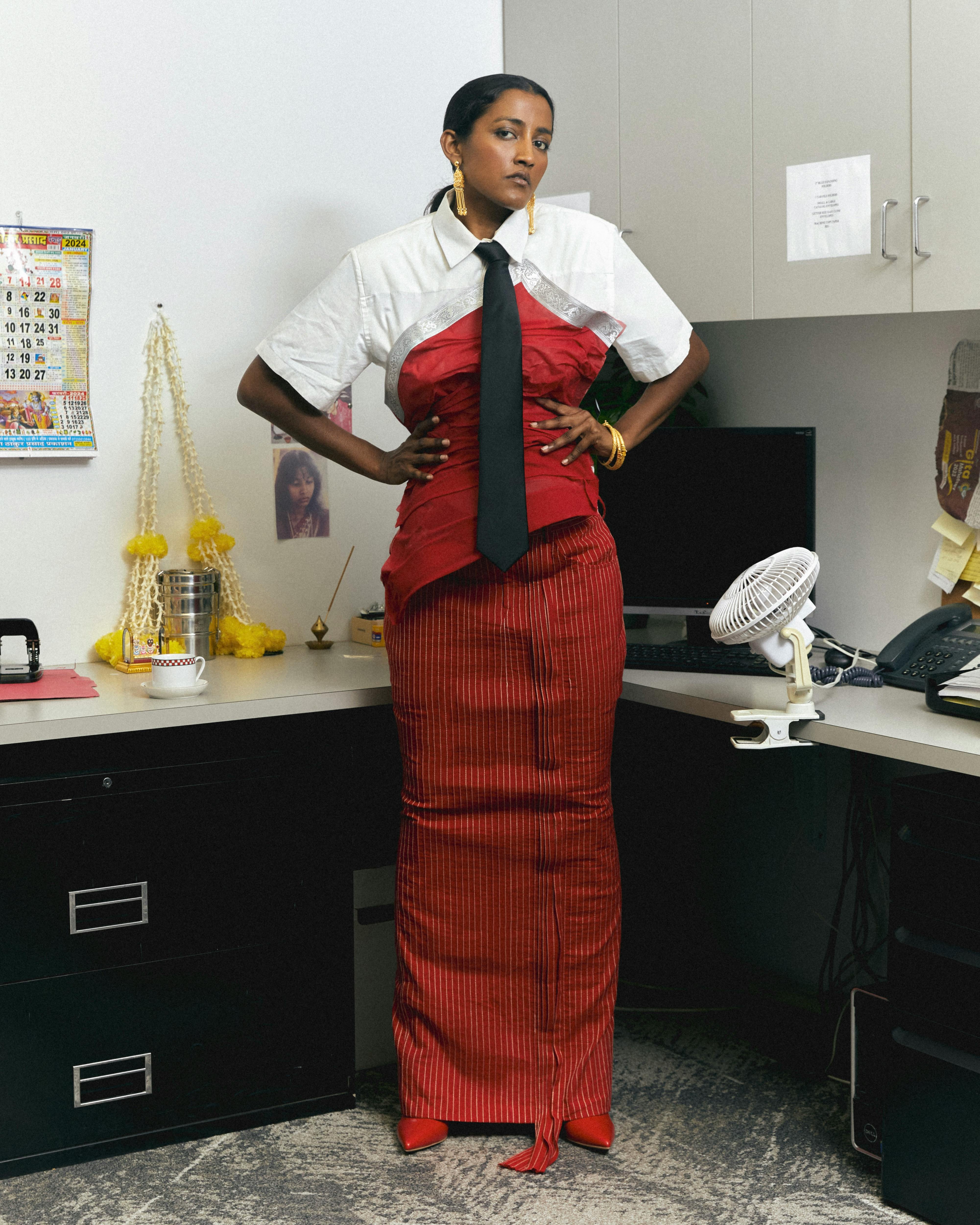 The 25-year-old is, however, incredibly humble about her achievements so far. She credits her parents’ example for allowing her to get to where she is today, as she watched them toil to build a life for their family in the U.S. after immigrating from India. Her Fall/Winter 2024 collection, “Fall In Love with the Roots Before the Flowers,” pays homage to them by tapping into ‘90s corp-core, blending remixed workwear (think flirty knotted blazers and deconstructed trousers) with South-Asian references such as pleats and drapes. The designer shot the lookbook in the very office building where she and her siblings would spend afternoons and weekends when her parents couldn’t secure a babysitter—now, her mom and dad own the company.