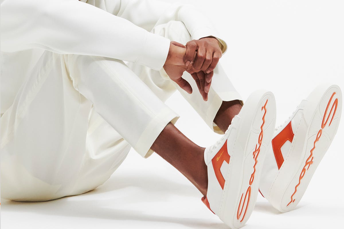 As far as sneakers go, the Double Buckle Sneaker is elegant, unobnoxious, and comfortable – boasting an upper shaped from Santoni’s signature calf leather. The name Double Buckle Sneaker is in reference to a graphic icon (which acts as a sort of placeholder where buckles would typically be located on Santoni’s more traditional shoes and loafers) that distinguishes the shoe from its competition. The graphic is painted in a variety of colorways, notably “Arancio Santoni” (orange) and blue, but will soon be available in white and green as well. The name Santoni is vibrantly splashed under the sole as a final garnish to the shoe.
