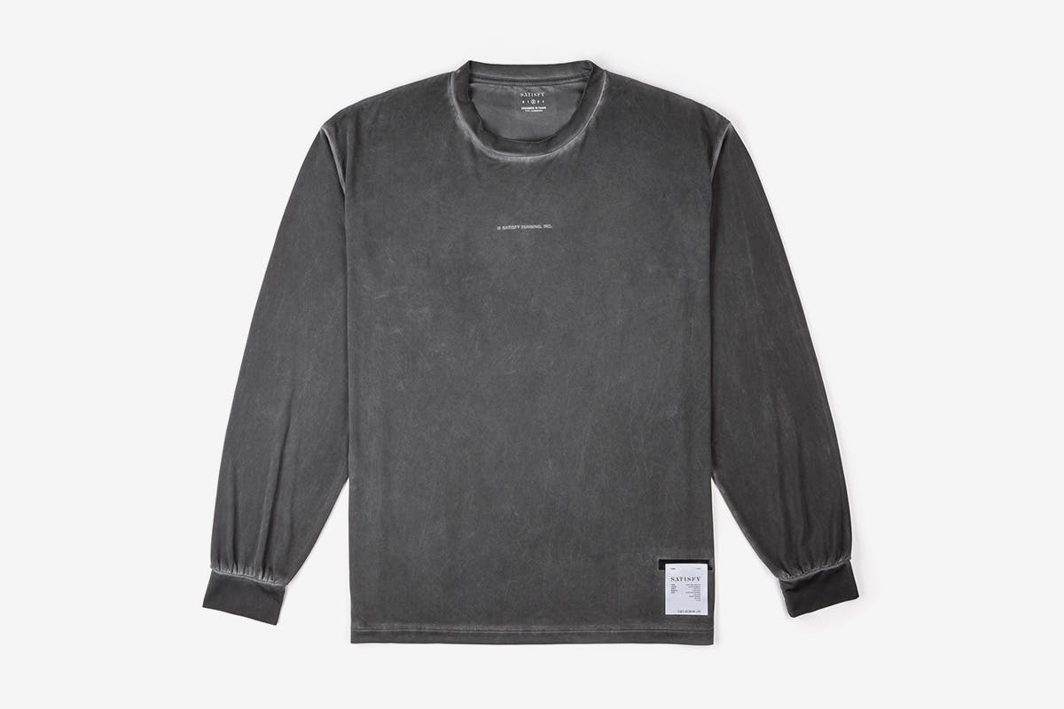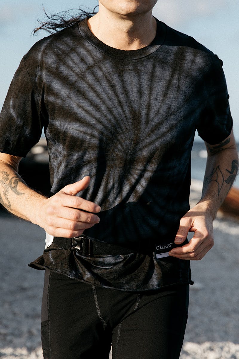 The collection contains a full wardrobe of running gear including tanks, tees, hoodies, workout pants, water bottles, running belts, and caps. The soft cloud merino wool is hand-dyed using a traditional Japanese shibori method; the collection's more neutral tones are awakened with a silvery aluminum-charged ripstop fabric.