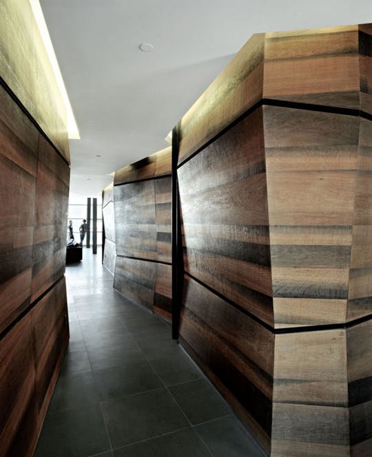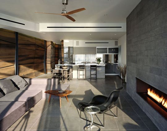 Today we take a closer look at the new Schein Loft, located in Manhattan, New York, and designed by Archi-Tectonics. Housed in a very modern building, the architects of course went with an equally modern interior. What we enjoy the most though, is the inclusion of the mountain-chic look in the apartment, especially of course seen in the heavy used of wood on the walls, as well as the fire place.