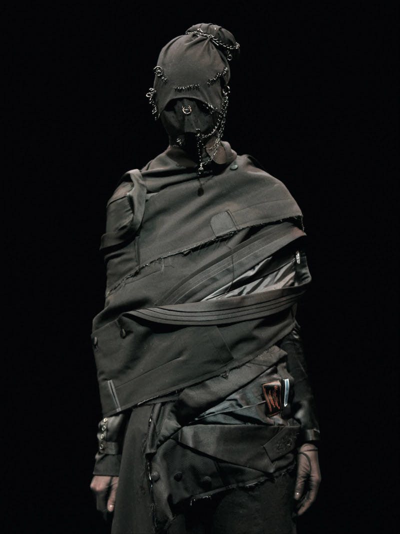But for me, nothing hits the mark like Jun Takahashi’s FW06 collection for Undercover. In her runway recap, Vogue’s Nicole Phelps wrote: “chain-covered headdresses evoke medieval armor (as well as – a shade more sinisterly – prisoners’ hoods),” but even this downplays the line’s effect. This is the figure of man as matter – unveiled the same year images of torture at the Abu Ghraib prison in Iraq were released – a statement that stretches to fashion’s material core.