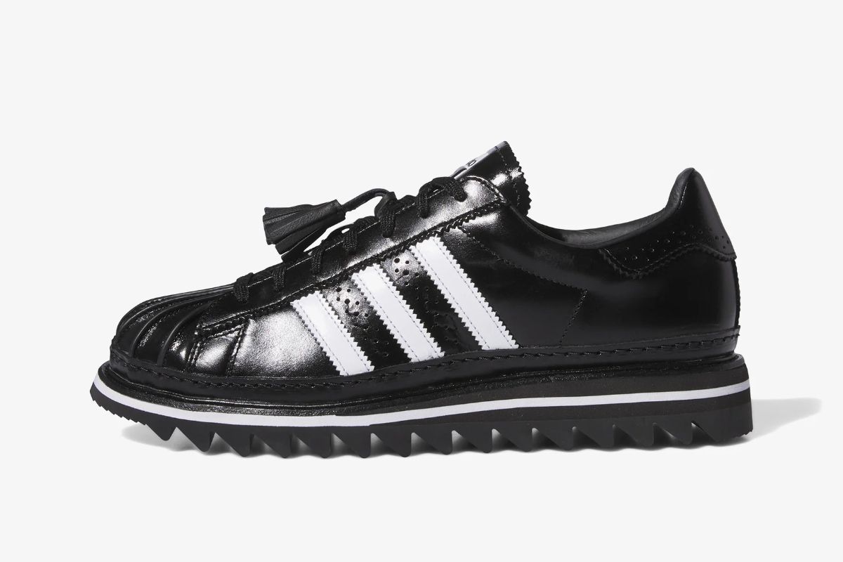 Editor's Notes: CLOT and adidas serve up a second iteration of its Edison Chen-designed Superstar. Detailed in a new shiny, black colorway with a chunky, serrated sole, the collaborative sneaker has a formal twist.