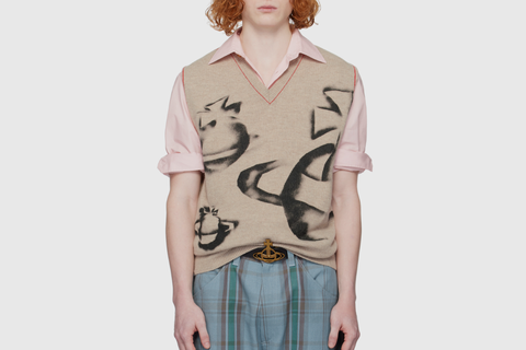 Westwood’s world is punk at heart but grounded in heritage tailoring. The Orbit vest quietly nods to her subversive legacy for classic knitwear infused with anti-establishment energy.