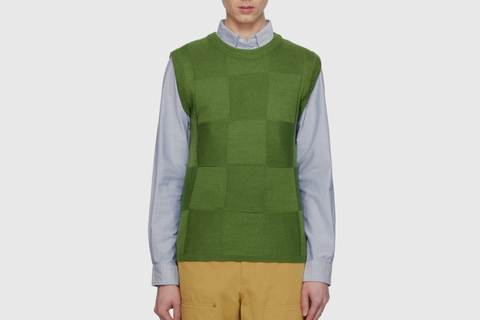 Rooted in Korean streetwear culture, After Pray explores everyday uniforms with a twist. This checkerboard knit vest leans graphic and youthful making an eye-catching statement for layered casual looks.
