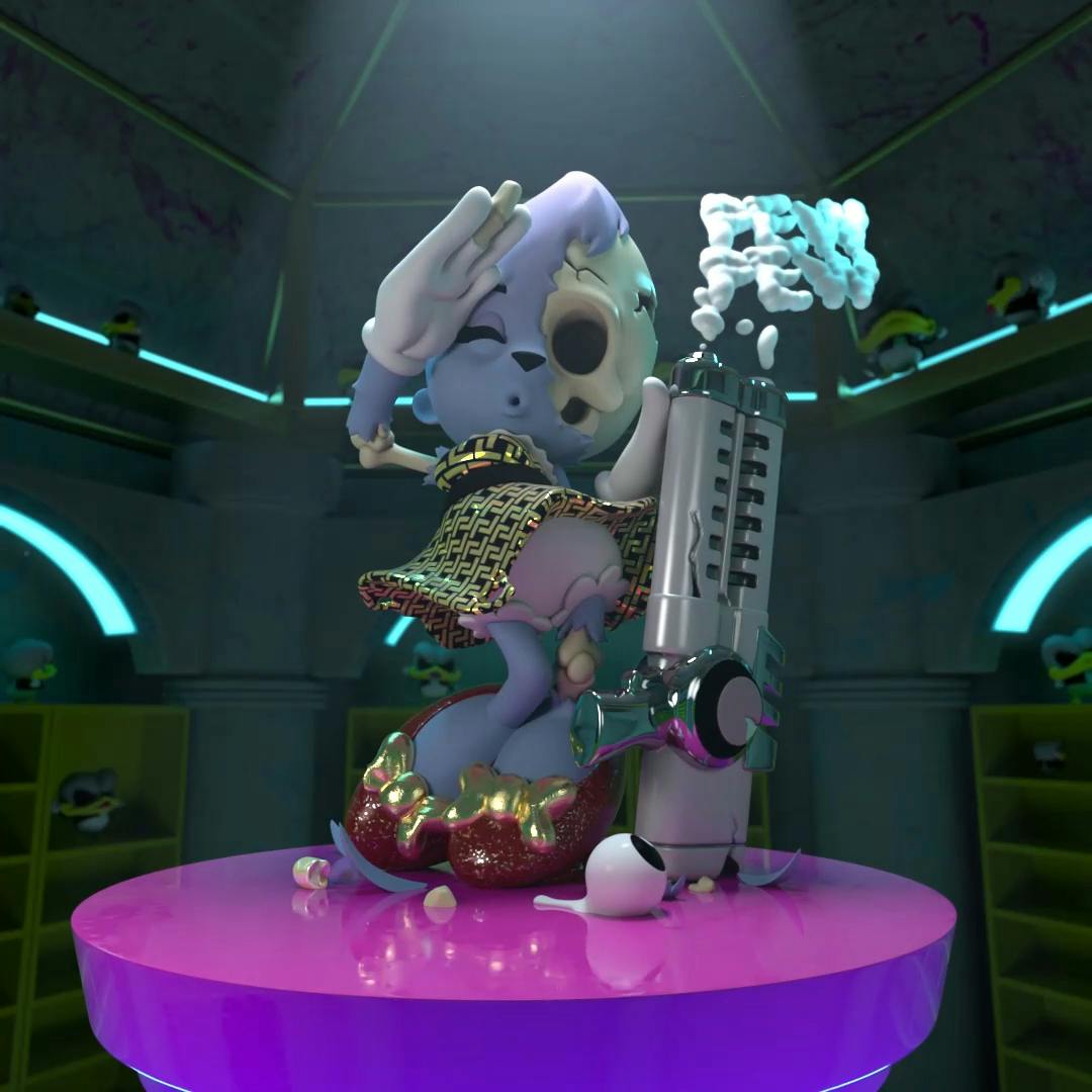 Launched on April 18 on Nifty Gateway, SUPER TRAGIC is a collaboration with the artist Matt Gondek and is made up of five animated NFTs. Each NFT features a Superplastic character being destroyed by Gondek’s own duck-like characters, The Little Shits. In addition, they also sold four limited edition auction pieces as part of the same NFT collection.