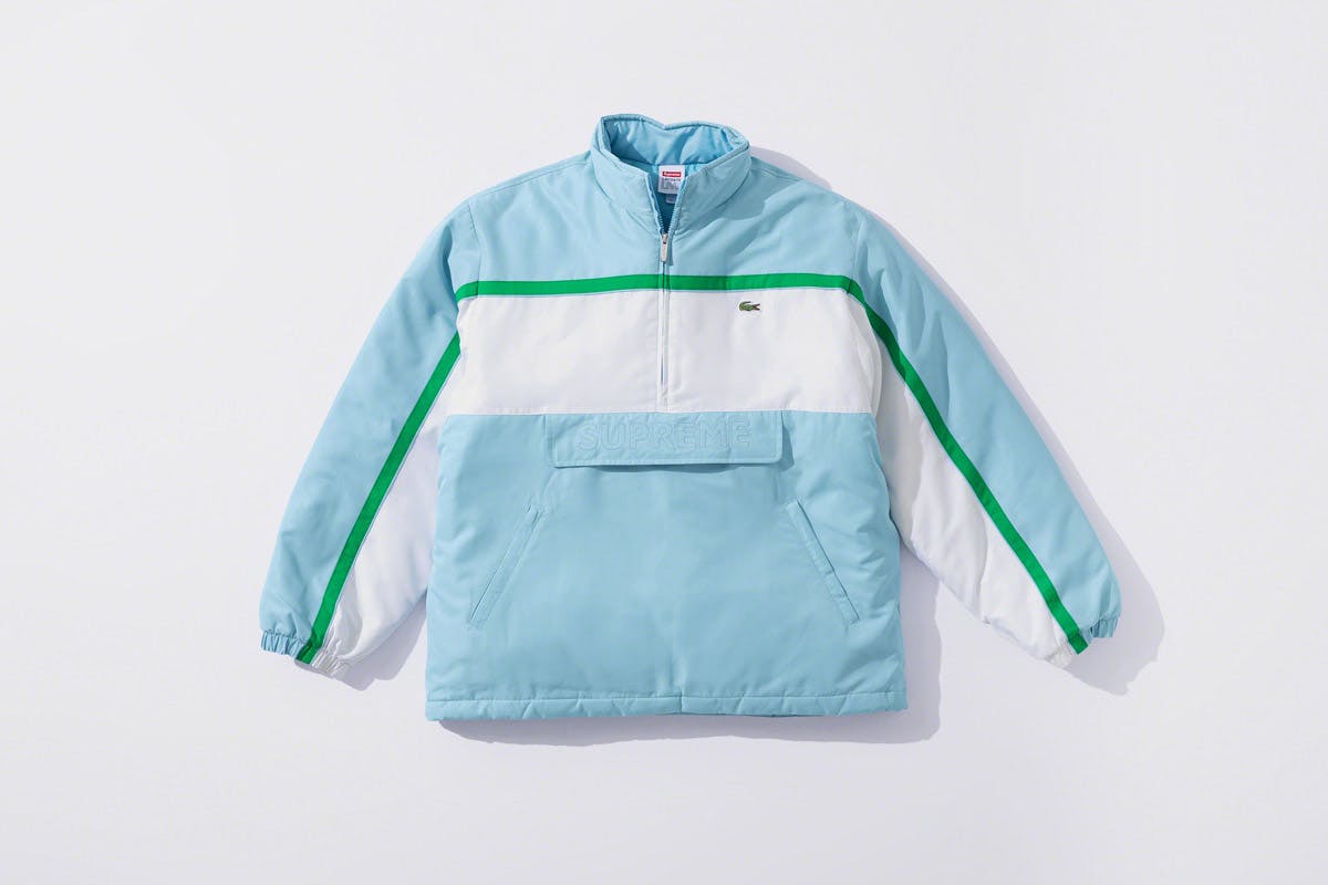 The collaboration also features a puffa half-zip jacket, which benefits from large Supreme branding across the chest, Lacoste's iconic crocodile logo, and matching track pants. Elsewhere you'll find co-branded hoodies, track pants, and shorts. Each garment arrives in a series of alternate colorways including red, black, mustard yellow, pinks, and light blue. In terms of accessories, the drop features messenger bags, 6-panel caps, and beanies.
