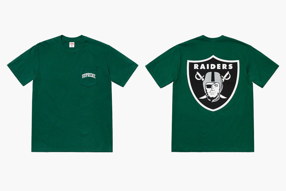 T-shirts come in red, white, black, and red colorways with a Supreme logo on the breast pocket and an oversized Raider's logo on the back.
