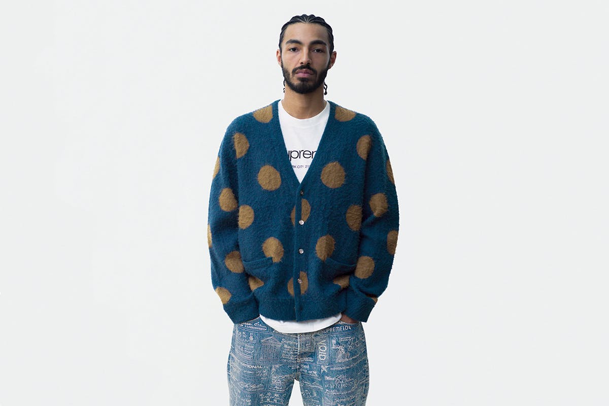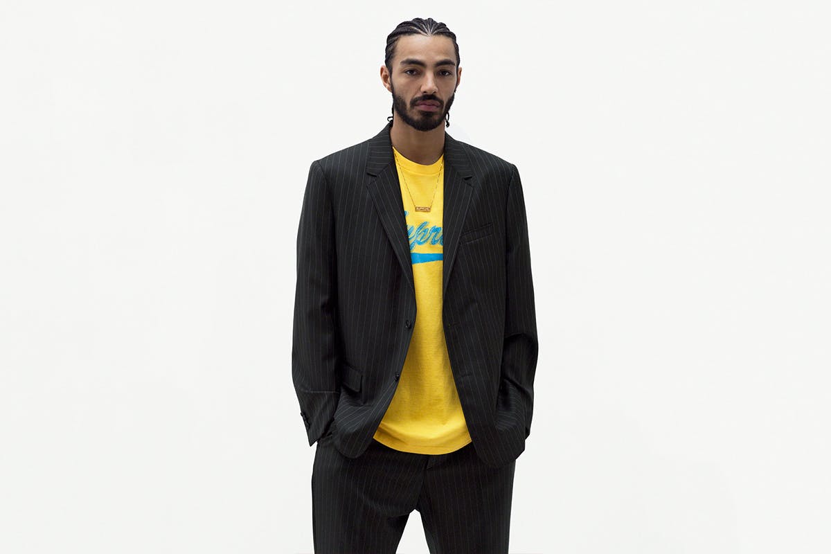 In addition to the graphic crewneck and varsity jacket mentioned above, the new lookbook previews a range of colorful short-sleeve shirts, graphic tees, denim jackets, pinstripe suits, polka-dot cardigans, basketball jerseys, hoodies, patchwork suede jackets, and more.