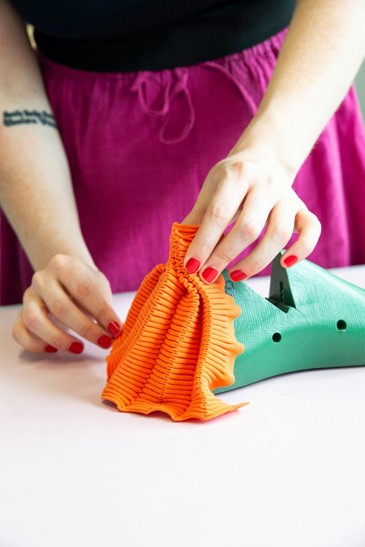 I'm Dutch, but I didn't grow up in the Netherlands. I lived in France, India, and Bhutan, so all over the place. I came back here to study product design. During my studies, I was always super interested in material research and flexible materials, experimenting with weird combinations and treatments of materials, or just manipulating them in a different way. I always liked textiles, but it wasn't really open to me during my studies. I always ended up making something into footwear. I eventually went to Finland to learn how textiles work, and the craft behind it.
