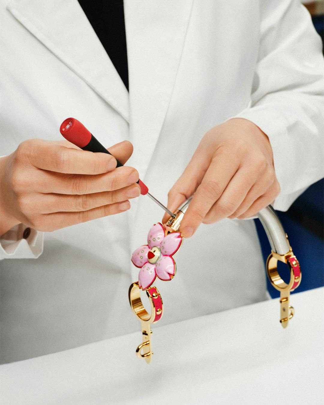 Digitally printed on top of LV’s classic monogram brown canvas, cherry blossoms appear on bags of almost every variety, from tiny handbags to suitcases. Plus, there’s also a range of pink-colored, flower-adorned handbags to choose from.
