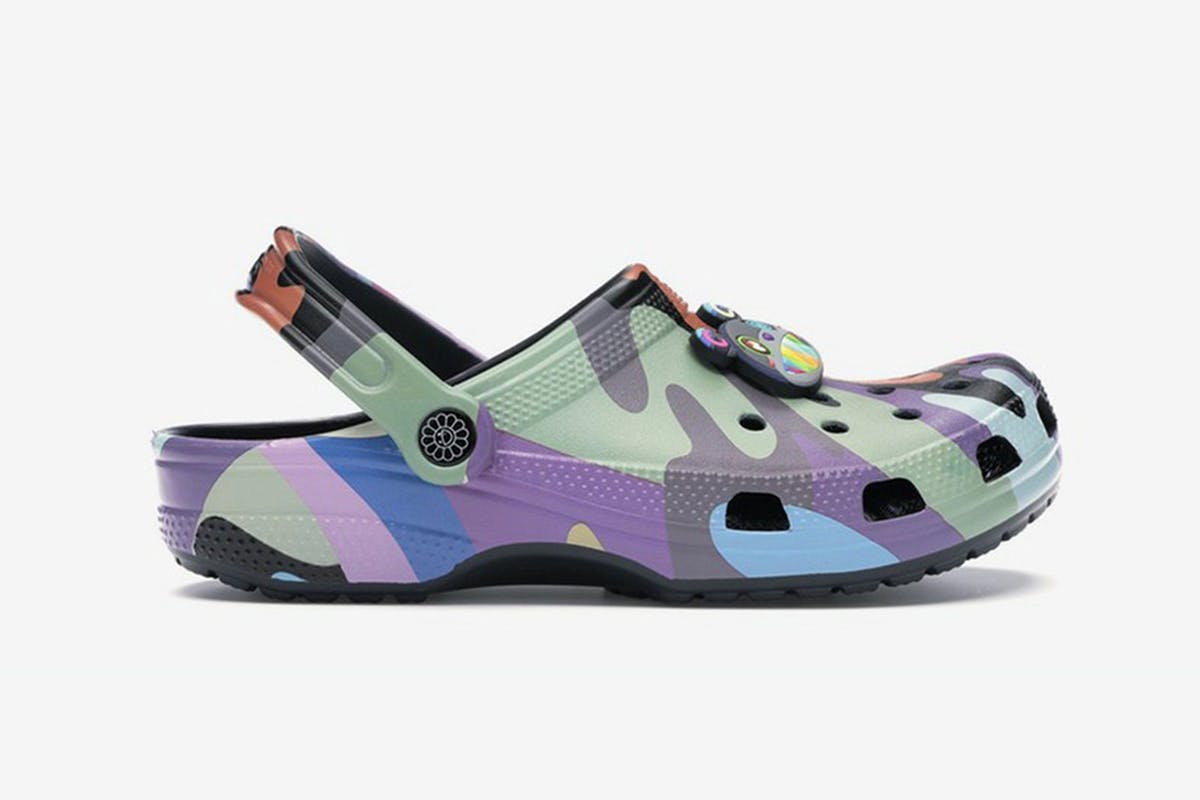 Murakami's Crocs collaboration was released exclusively at ComplexCon in 2019. Inspired by his vibrant illustrative style, the Crocs were decorated in a multicolor camouflage, then featuring a teddy bear Jibbitz charm and his smiling daisy on the strap. The footwear was also adorned with a special graphic on the insole and outsole.