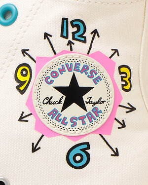The Tamagotchi x Converse sneaker celebrates the beloved digipet's kawaii legacy. The sneaker brand's iconic hi-top shoe, offered in off-white and blue, turns the All-Star ankle patch into a whimsical doodled clock, while the other side is embellished with an exasperated Tama in a spaceship.