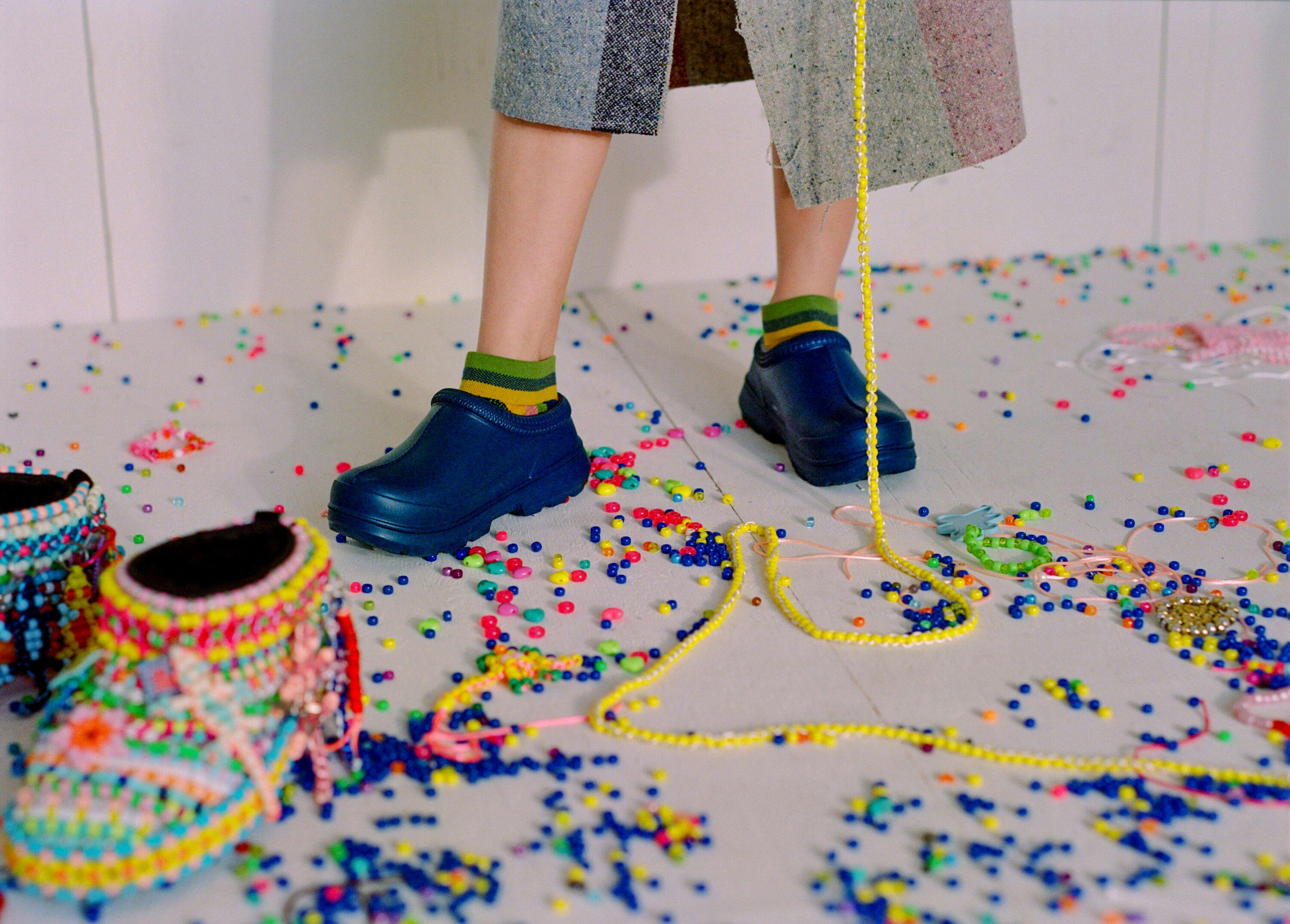 Indeed, Rogen fronts the partnership's vivid visuals alongside bead artist Jaime Gerin, glassblower Cedric Mitchell, textile artist Sesan, and surfboard shaper Kyle Albers. Oh, and there's also a massive plush figure called the "Abominable UGGman," realized with a similar colorful patchwork like the collaboration's plush slides.