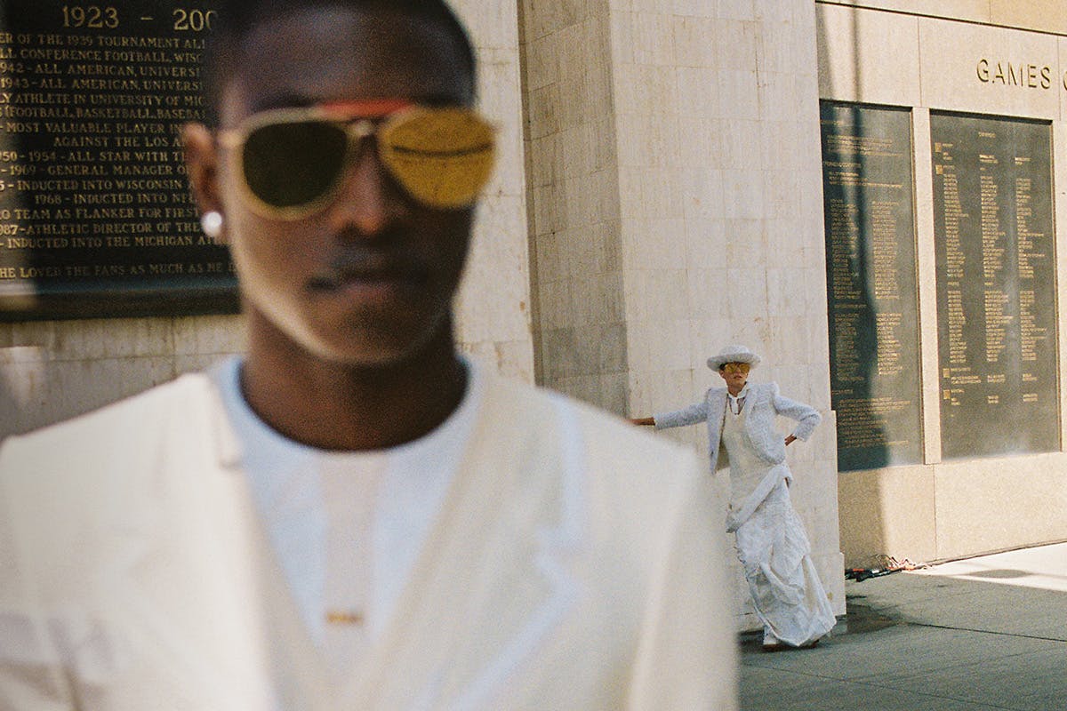In Browne's world, future athletes wear all-white fits, in line with the American designer’s take on uniformity that his namesake fashion line has become synonymous with since its inception in 2001. That also means uniformity across gender, men in knitted dresses, pleated skirts and giant pussybow shirts, women in broad-shouldered overcoats, oxford wingtips and suit and tie subtly covered in Browne’s trademark geometric way of sketching clothes. All in shades of eggshell, off-white and ivory, or so says my color chart.