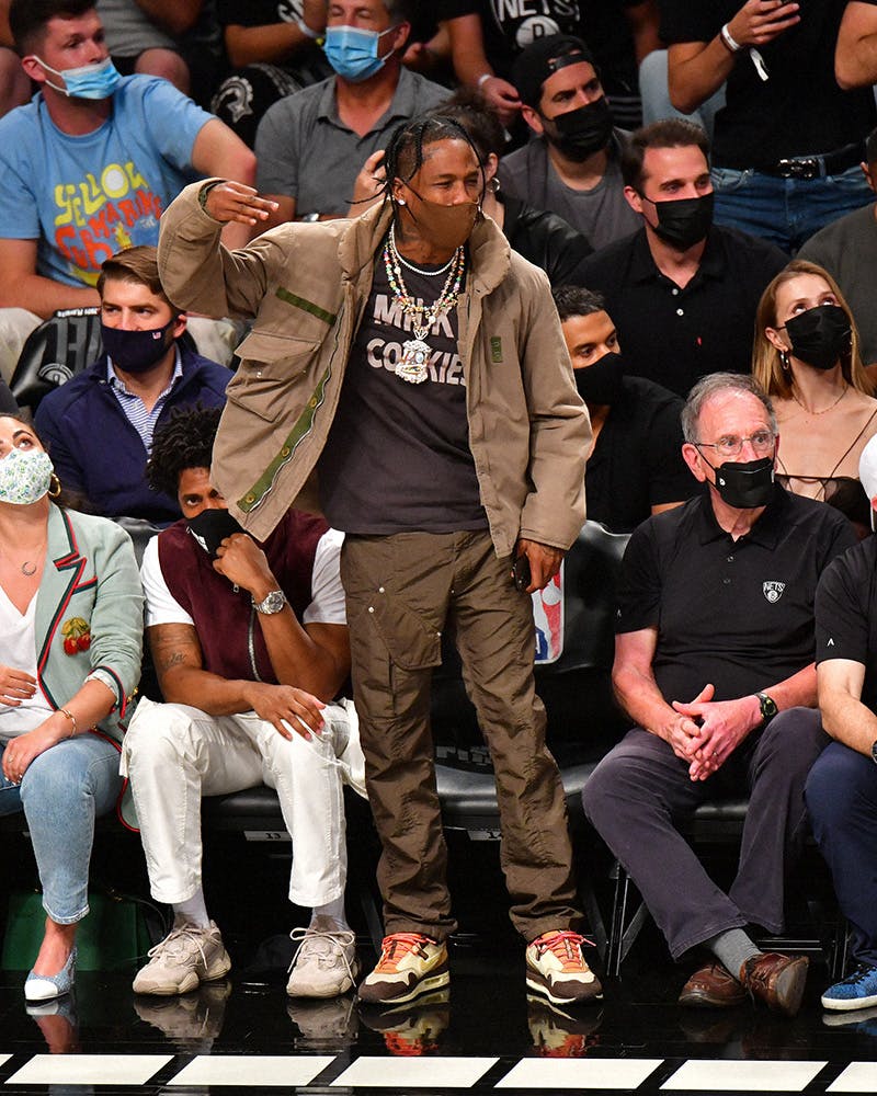 Travis Scott was courtside to watch the Brooklyn Nets beat the Milwaukee Bucks in the first round of the NBA Playoffs on Saturday night. The Nets' Kyrie Irving's wild three-pointer had the Houston artist out of his seat. Travis' outfit, his jacket especially, had us out of ours.