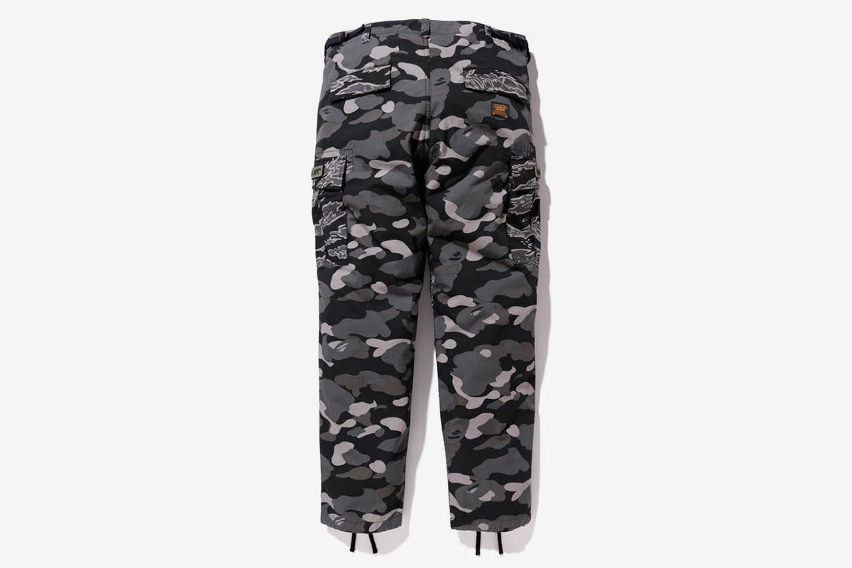 The apparel, which you can check out in full below, includes pants, T-shirts, crewneck sweaters, a Shark Hoodie, a parka, and a leather puffer jacket. Each of the pieces features nods to each brand in the form of military-inspired patterns, BAPE camo, and replaceable tags.