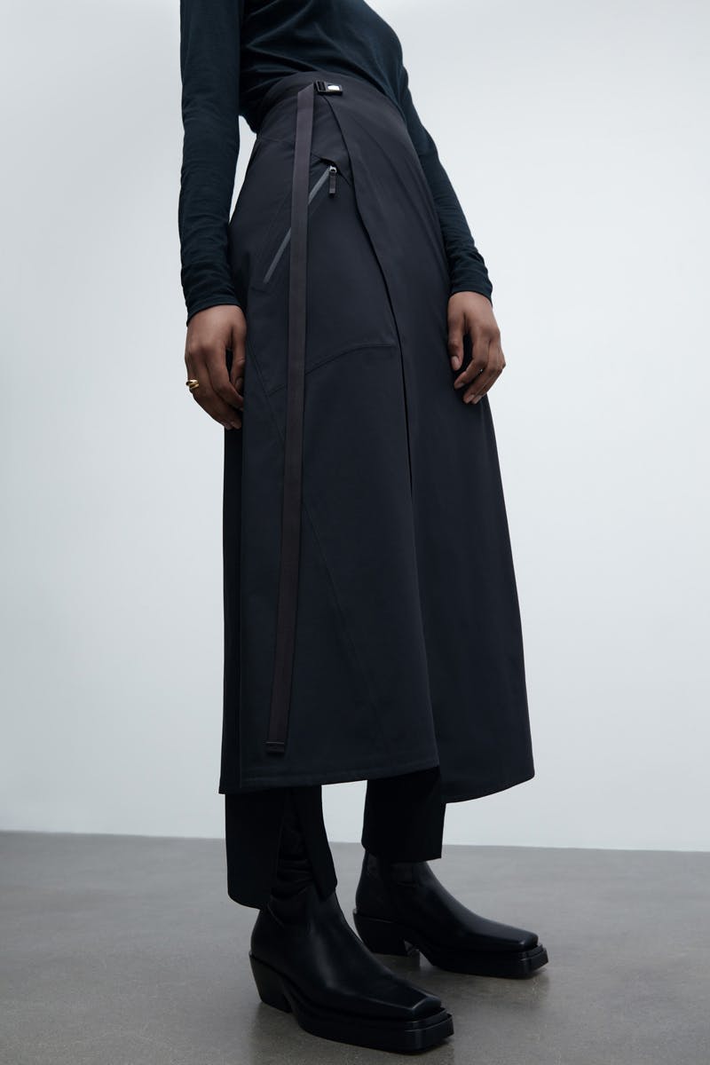 All 11 items, from down coats to knee-length raincoats to shell skirts to slit-hem trousers, reflect Veilance's knack for whittling a garment down to its basest form, regardless of gender. Futuristic uniforms for everyone!