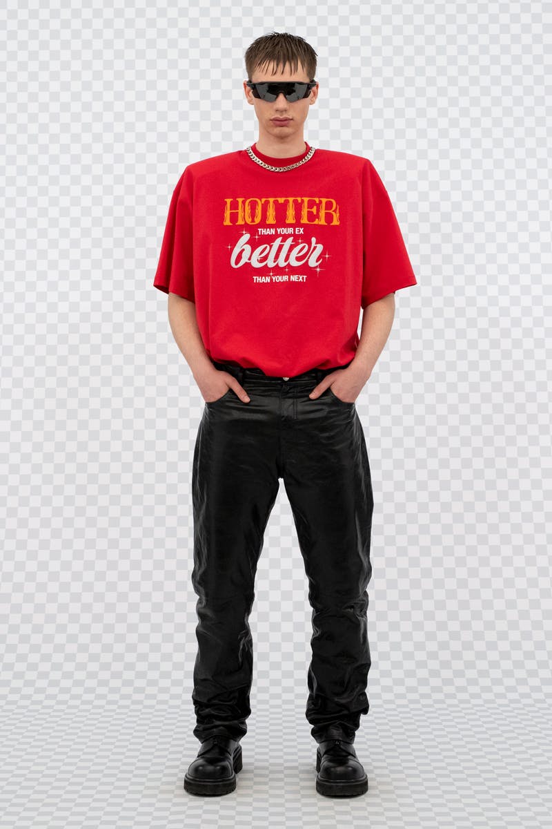 And quite literally, as evidenced by the flowing green numbers seen in the preview uploaded to Instagram by Vetements and its CEO, Guram Gvasalia. This visual motif was executed all-manner of ready-to-wear, including boxy coats that wouldn't look out of place in the early 2000s, a source of much inspiration for the Zurich-based fashion brand. Need proof? Look no further than its ever-present sporty sunglasses and cheeky slogans ("HOTTER Than Your Ex BETTER Than Your Next" and, yes, "VTEMETNES: Think Differently").
