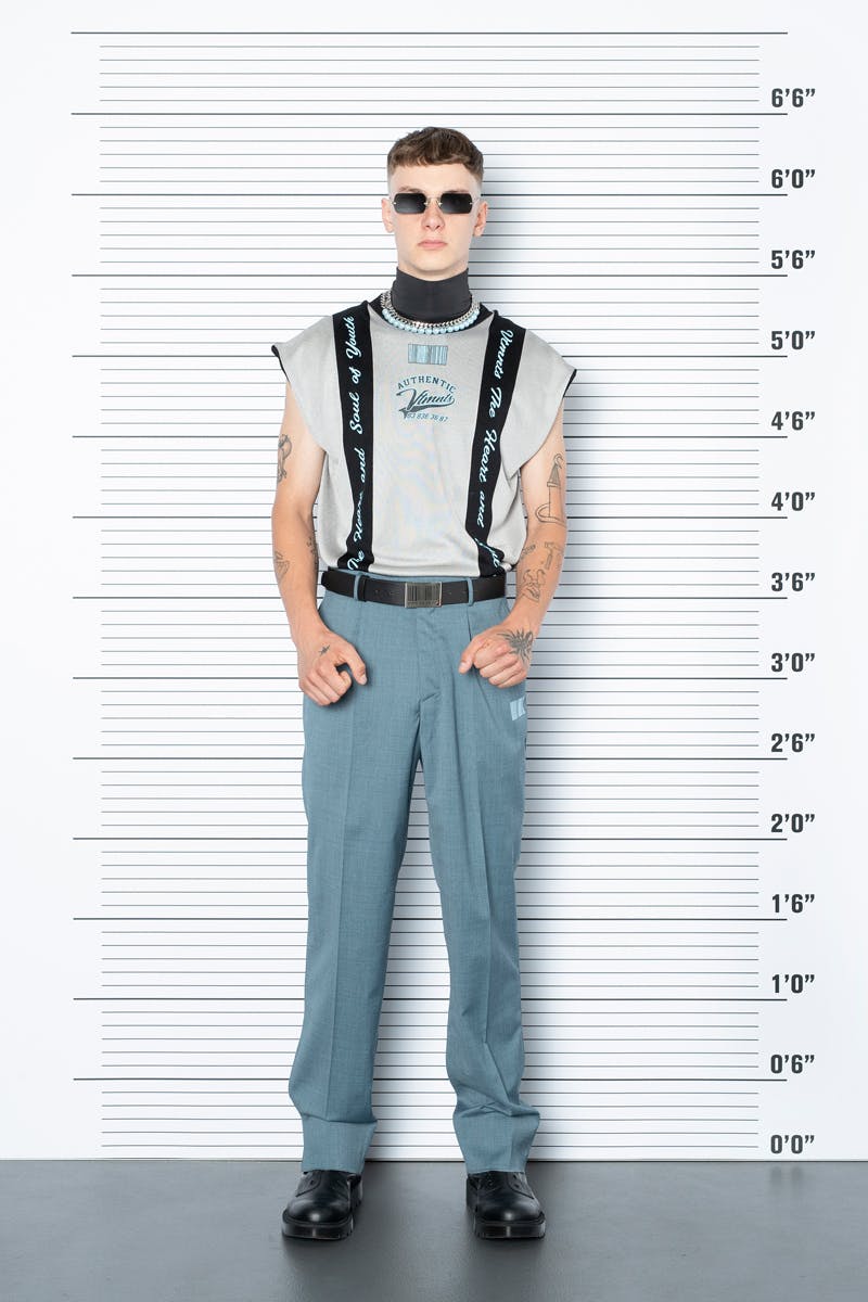 Though VTMNTS does indeed deliver many Vetements-like bits — including leather blazers, skin-tight sleeveless tees, baggy slacks, Matrix-y graphics, and very Matrix-y glasses made of solid and white gold — it's distinguished by more proportional silhouettes and more recognizable garments.