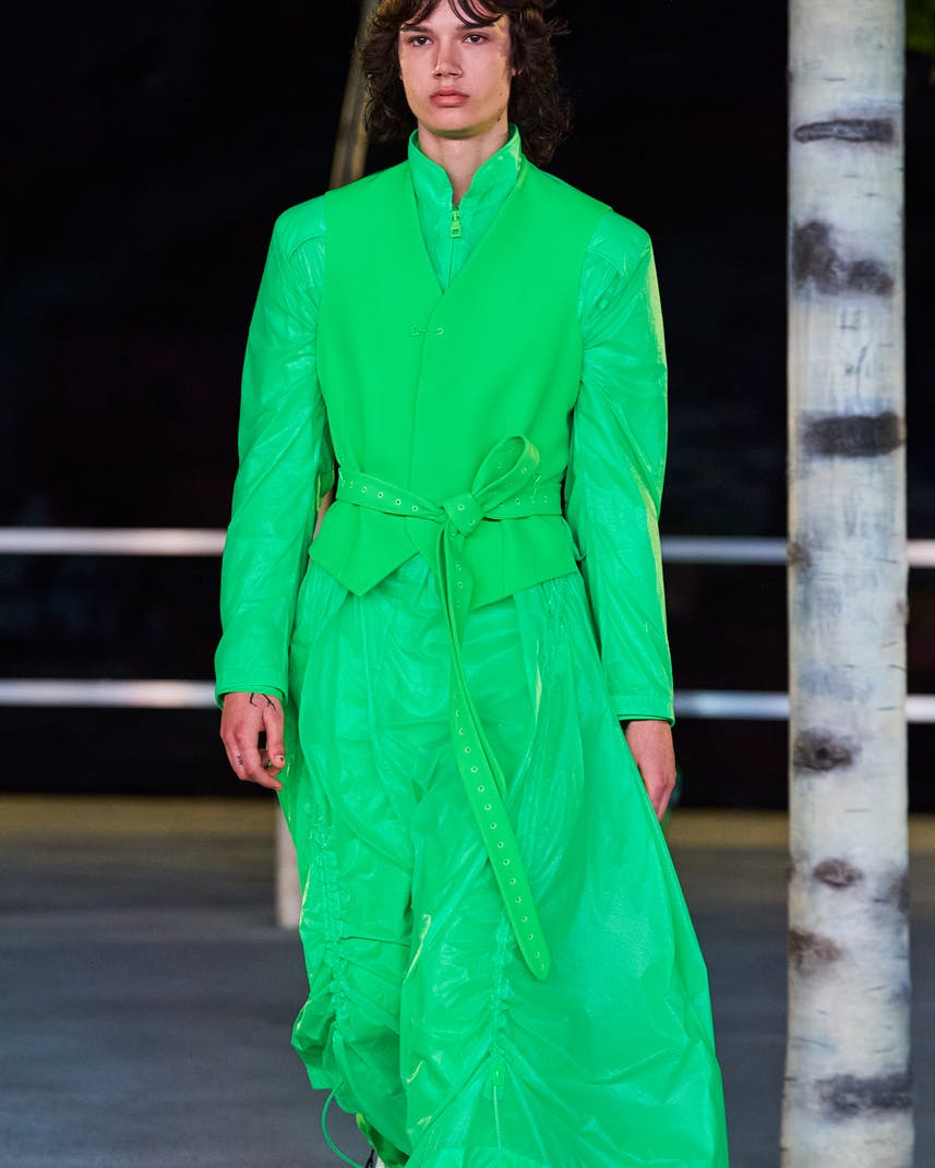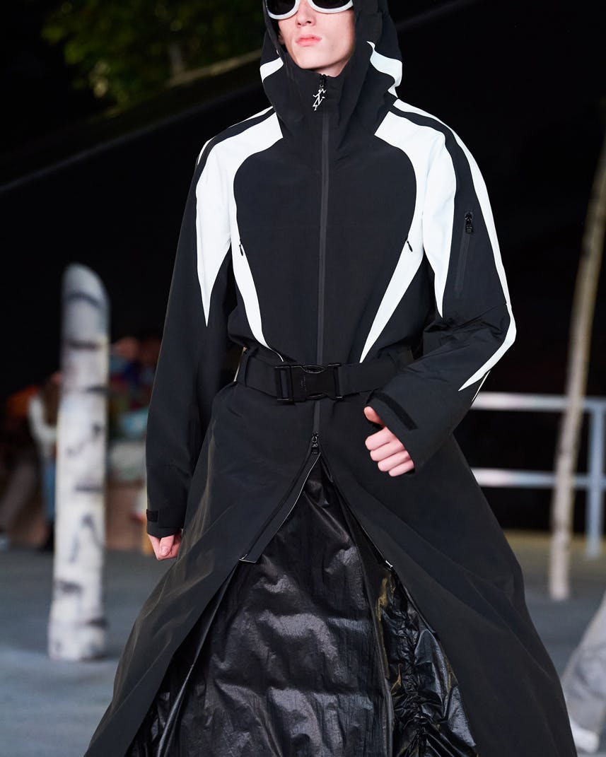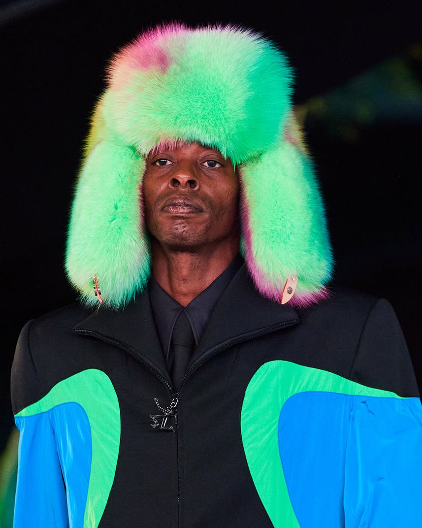 These silhouettes did return some form or another, though — new iterations of the Jamiroquai-inspired caps and duffels appeared alongside other fresh pieces, like knit sweaters that extended into head-covering shrouds and mesh monogrammed sets.
