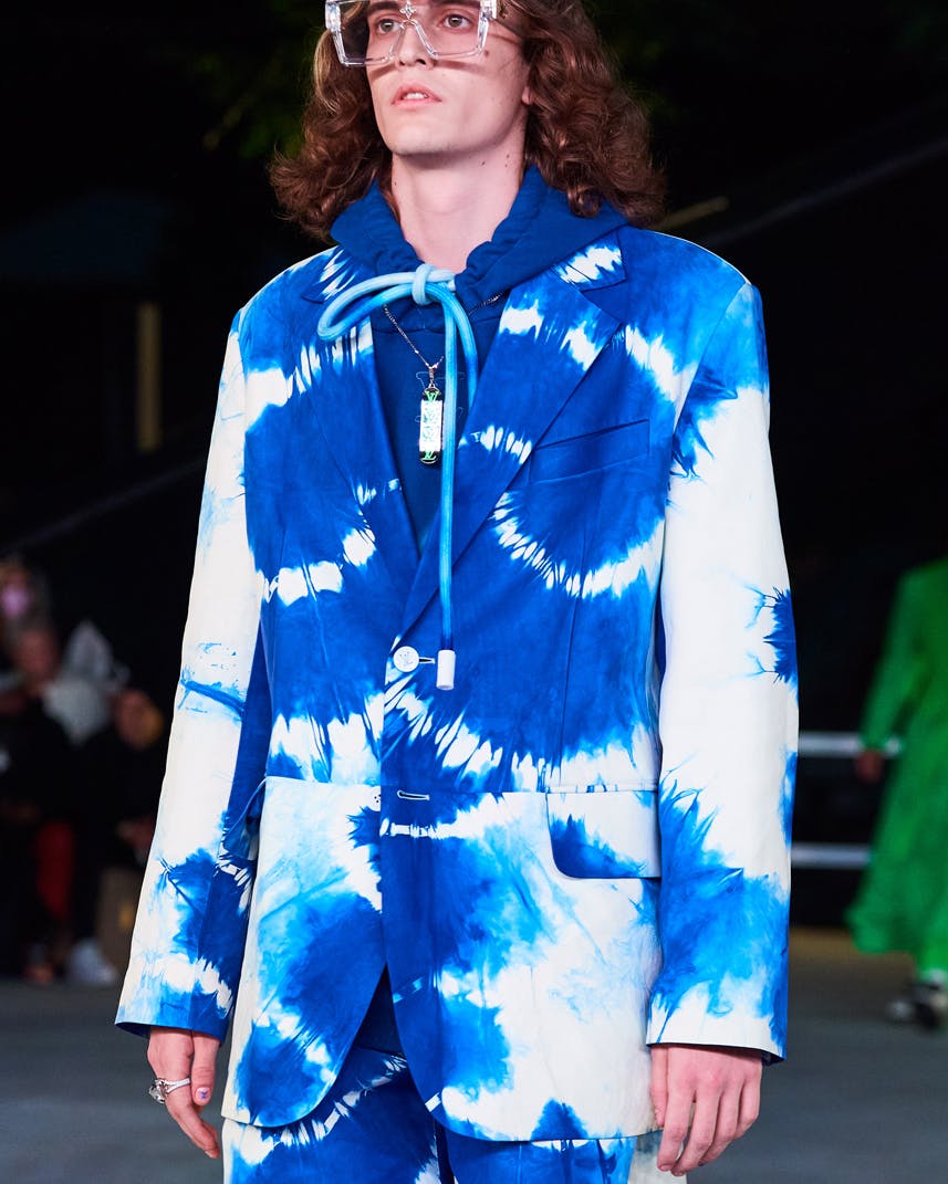 Tie-dye, scalloped edges, metallic silver leather, puffy knee-high sneakers, suiting framed by crystalline appliqué, and hockey-inspired gloves: Louis Vuitton Spring/Summer 2022 isn't for the faint of heart or wardrobe.