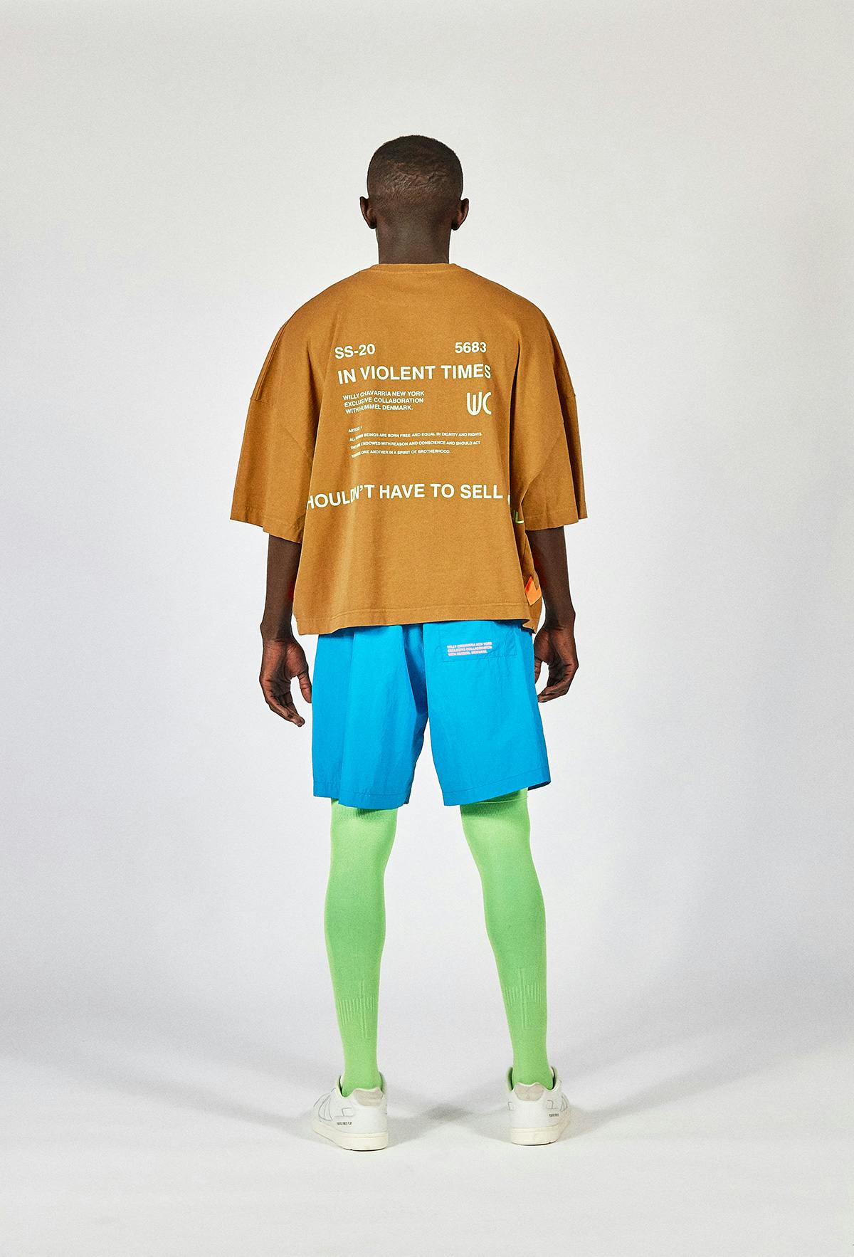 A striking palette of vivid cyan and radiant orange stands in contrast to a neutral tan-colored base. The 5683 logo has carried through from their first season together as the numeric correspondence to the English keypad for "L-O-V-E." Silhouettes are clean and easy to wear for both genders, while signature Willy Chavarria design elements are present, such as oversized styling with drop shoulders.