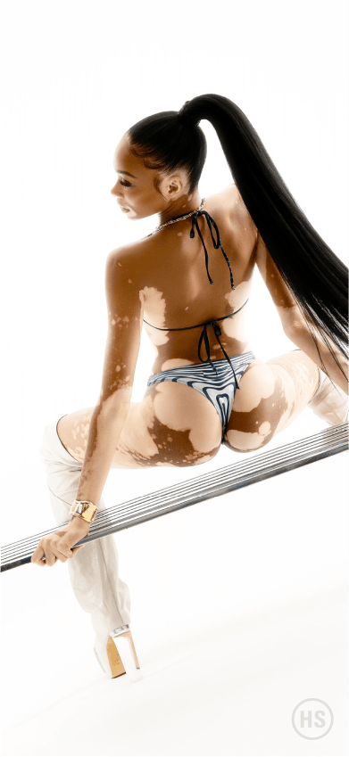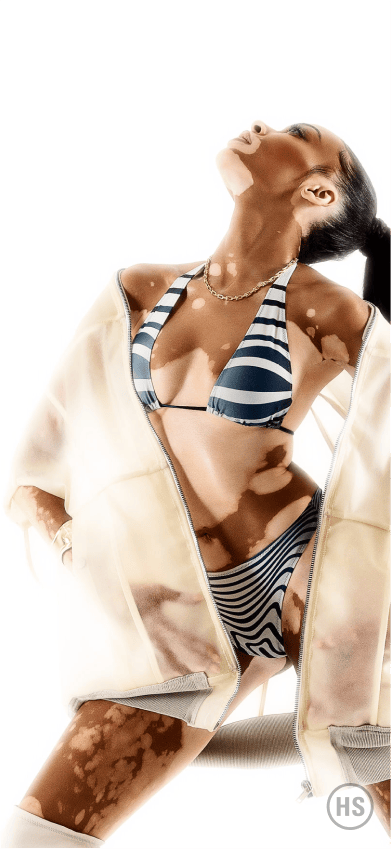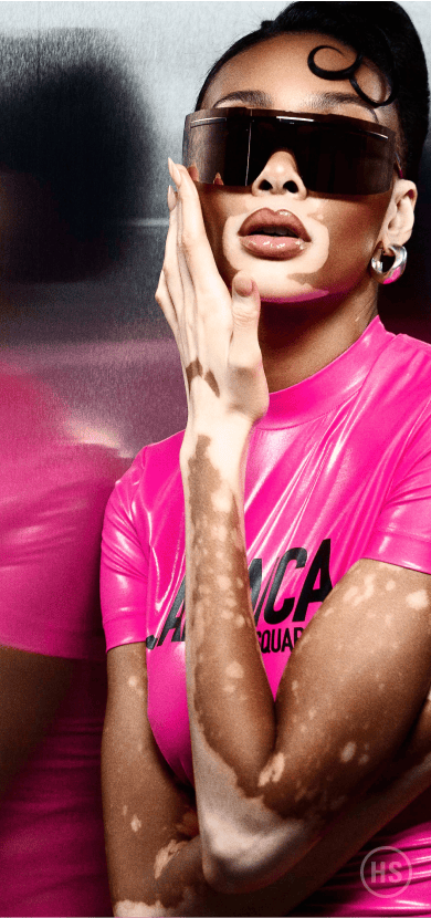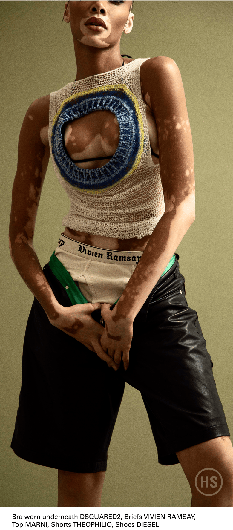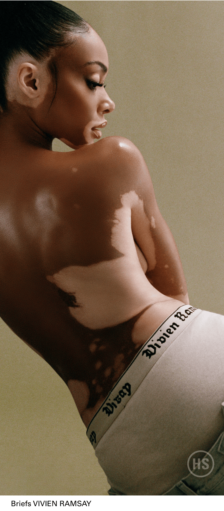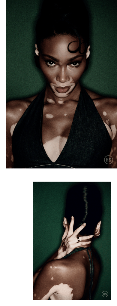 In her telling, Harlow had amassed more than 100,000 followers on Instagram by the time she was 18. The app was still in its infancy back then, but already, the model was finding work through the platform, doing shoots “here and there” for people in Toronto who asked her to pose in their beanies and sweatsuits. “I had built my following up just from posting and talking about my experience with vitiligo,” Harlow explains about that early visibility. “People would say, ‘My mom has vitiligo and I showed her your page. She’s had it since she was X amount of years old, and now she’s so confident looking at your pictures.’”