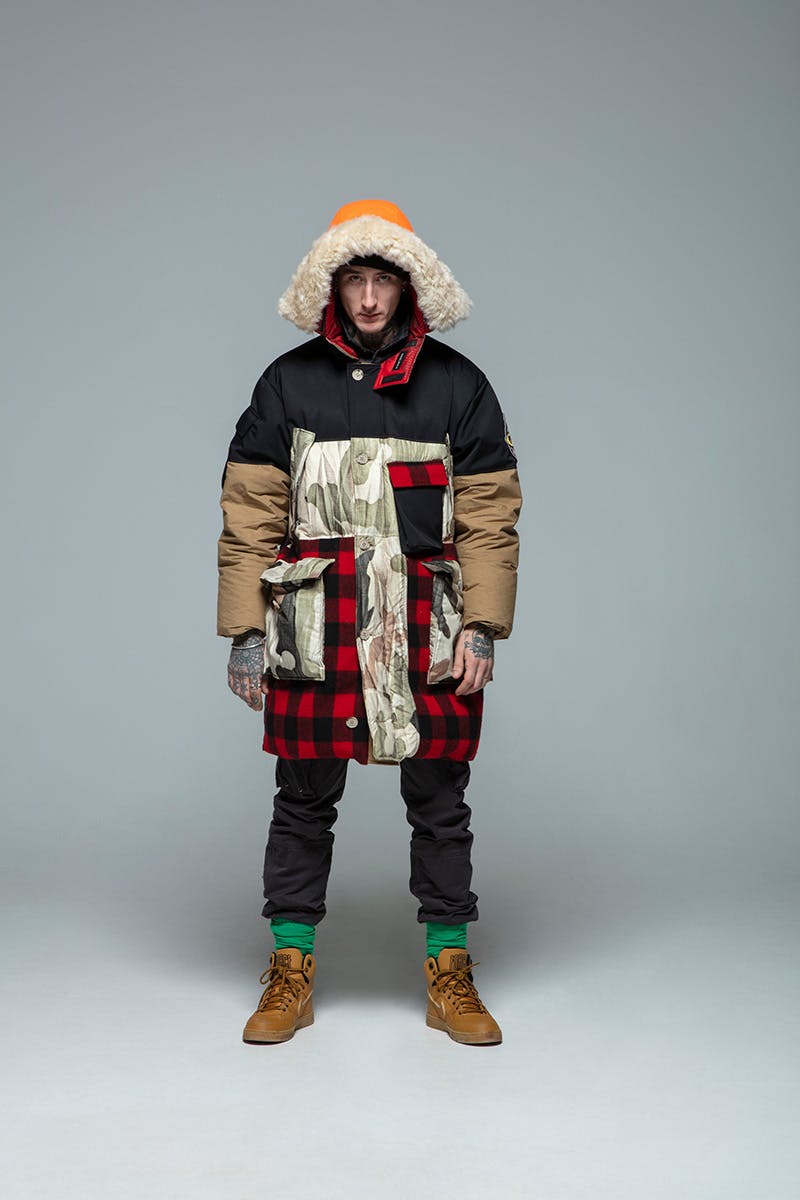 Woolrich x Griffin FW19 finds the brands cutting down on the leading source of waste during production processes, water. They utilize 60 percent organic cotton and 40 percent recycled nylon that is printed rather than colored to reduce the environmental impact. A standout garment created from this technique is a reversible parka that features a zipper closure at the side seams, which transforms the shell into a poncho.