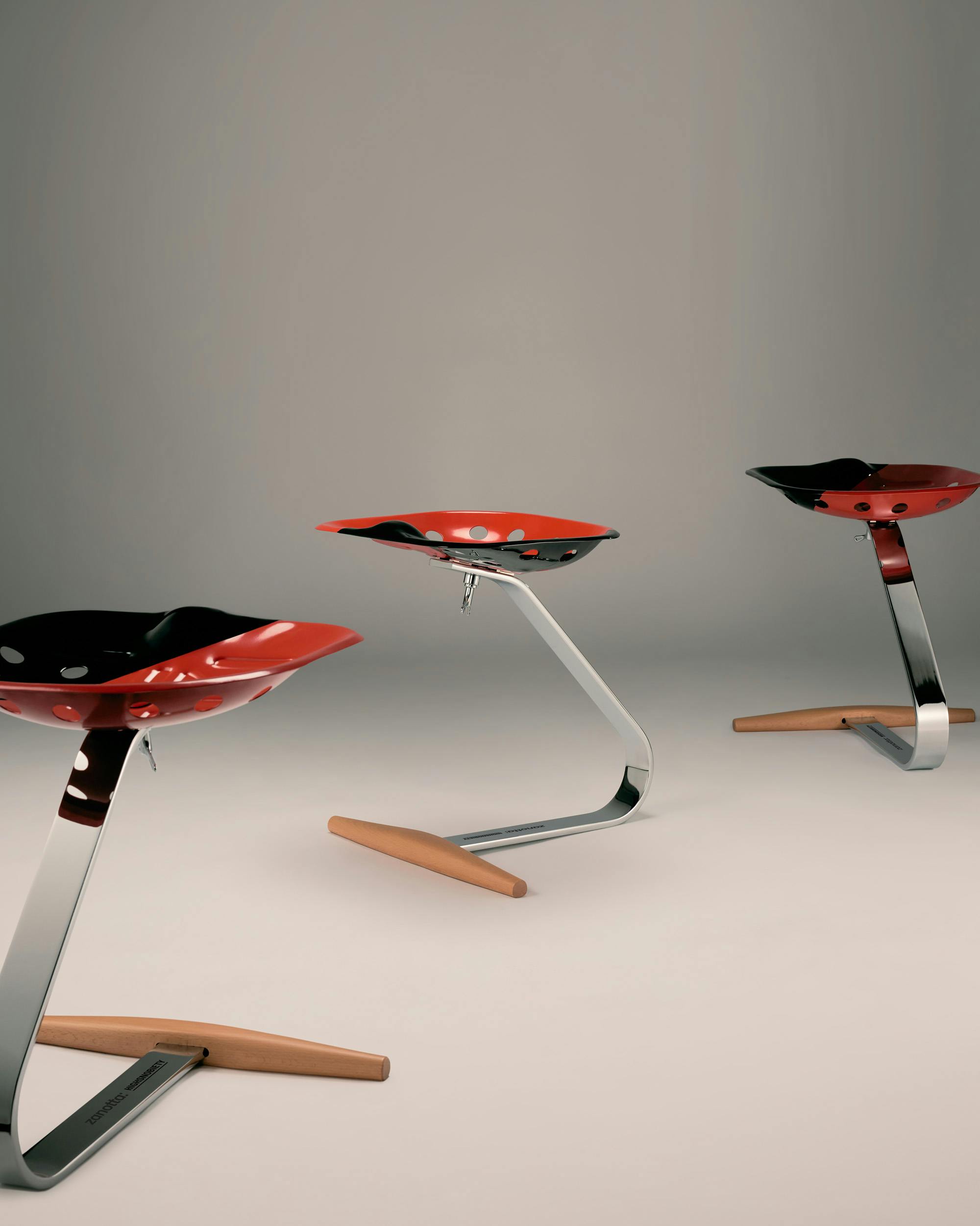 The Mezzadro stool is one of the Castiglioni brothers' most famous works, having been exhibited by esteemed galleries such as MoMA and the Vitra Design Museum, and it’s an example of how the duo repurposes elements from mass-produced equipment.